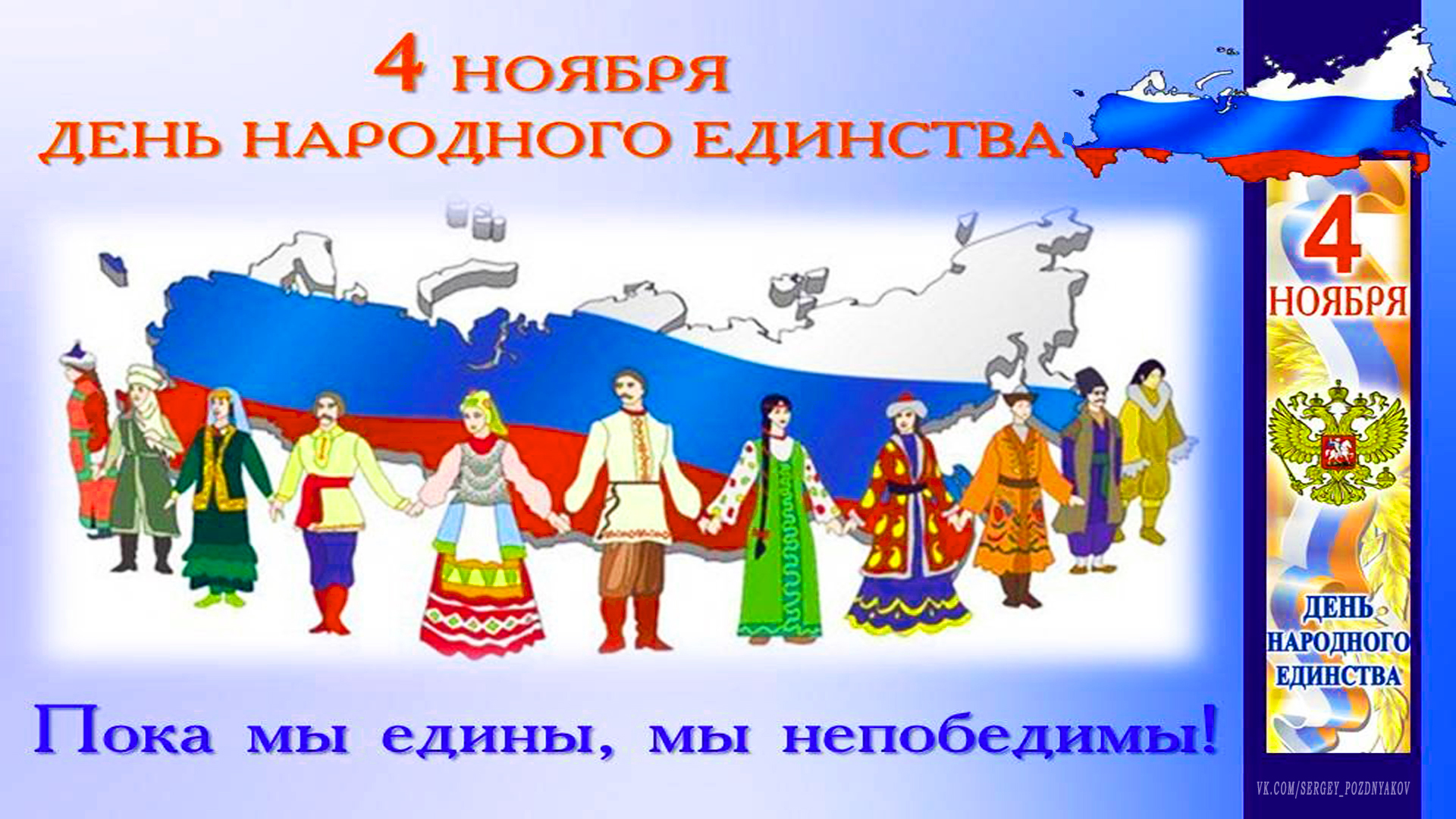 С днем народного единства! Давайте будем мы едины И уважать друг друга будем, Ведь вместе мы непобедимы, Мы все равны на свете, люди! Пусть все народы наши дружат И вместе счастливо живут! Пусть наполняют наши души Любовь, добро, мир и уют! - Подписывайтесь на мой канал в YOUtube https://www.youtube.com/channel/UCQBy3iEELc0ltPAt_gkCkOQ - Я в Rutube https://rutube.ru/channel/26552914/ - Я VK https://vk.com/sergey_pozdnyakov - Я в ОК https://ok.ru/group51148294651980 - Я в Яндекс Дзен https://zen.yandex.ru/id/608c778a1f08643617f9a192 - Моя БИБЛИОТЕКА https://vk.com/market-11000336?section=album_1 - #деньнародногоединства #поздравление #сднемнародногоединства