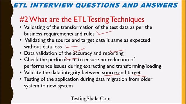 ETL testing interview questions and answers for freshers and experienced part1 | testingshala #ETLtesting #interviewquestions #testingshala #databasetesting #gangadharcm #freshers #experienced #testingguru #softwaretesting #manualtesting #automationtesting #manualtester #automationtester 1) What is ETL testing? It is extract, transform and load testing. • Data is extracted from the source like database or spreadsheet. • After that it is transported as per the business rules. • Later it is loaded into data ware house system or target system. 2) What are the ETL testing techniques? • Validating the transportation of test data as per business rules. • Validating source and target data without loss of data. • Data validation and accuracy while reporting defects. To check the performance and to ensure there is no reduction in performance while transporting or extracting data. • Validating data integrity between source and target. • Testing application during data migration from one system to another. Tricky Software testing interview questions : https://www.youtube.com/watch?v=t-AY-72rH8s ETL testing interview questions : https://www.youtube.com/watch?v=orW1SoT8KZE API testing interview questions : https://www.youtube.com/watch?v=_MccTd57xKU Real time testing interview questions : https://www.youtube.com/watch?v=HtswW3S19mg Mobile App Interview questions : https://www.youtube.com/watch?v=DNC1gxSgX7s Common FAQ : https://www.youtube.com/watch?v=xHu3-zews8o Challenging interview questions : https://www.youtube.com/watch?v=CoOM3HLSERw Interview questions for manual testers : https://www.youtube.com/watch?v=JMBgL7NePGE Interview questions for manual testers (part2) https://www.youtube.com/watch?v=WPn0nkX-Ryk Python interview questions : https://www.youtube.com/watch?v=GG4ISS82-wI Core java interview questions : https://www.youtube.com/watch?v=j2AkKDpH7DQ Tought interview questions : https://www.youtube.com/watch?v=Jgy2GGGdstg Regression testing interview questions : https://www.youtube.com/watch?v=fRXqSlVFkC4 Test Driven Development interview questions : https://www.youtube.com/watch?v=TqzAr-buUng SQL interview questions : https://www.youtube.com/watch?v=sM4c065rUmU Gangadhar CM Founder and CEO of Bada Brains Tech Services LLP (Owning multiple websites and YouTube channels) Worked in IT industry for 20+ years in various top notch companies such as Accenture, IBM, Sun Microsystems, Aztec Software.. Education Qualification- BE(CS), MTech(Software-Gold medal from VTU) Website : testingshala.com Facebook: Facebook.com/testingshala Twitter : twitter.com/testingshala