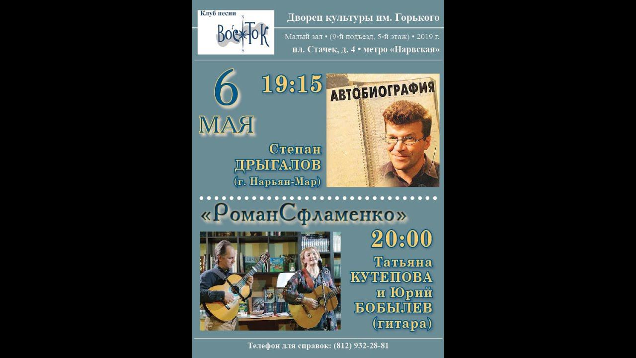 Татьяна Кутепова и Юрий Бобылев. "Роман с фламенко". Клуб песни «Восток». Санкт-Петербург, пл. Стачек, д. 4, ДК им. Горького, малый зал. 6 мая 2019 г. Запись видео - Алла Левитан. Запись и обработка звука - Дмитрий Зайцев.