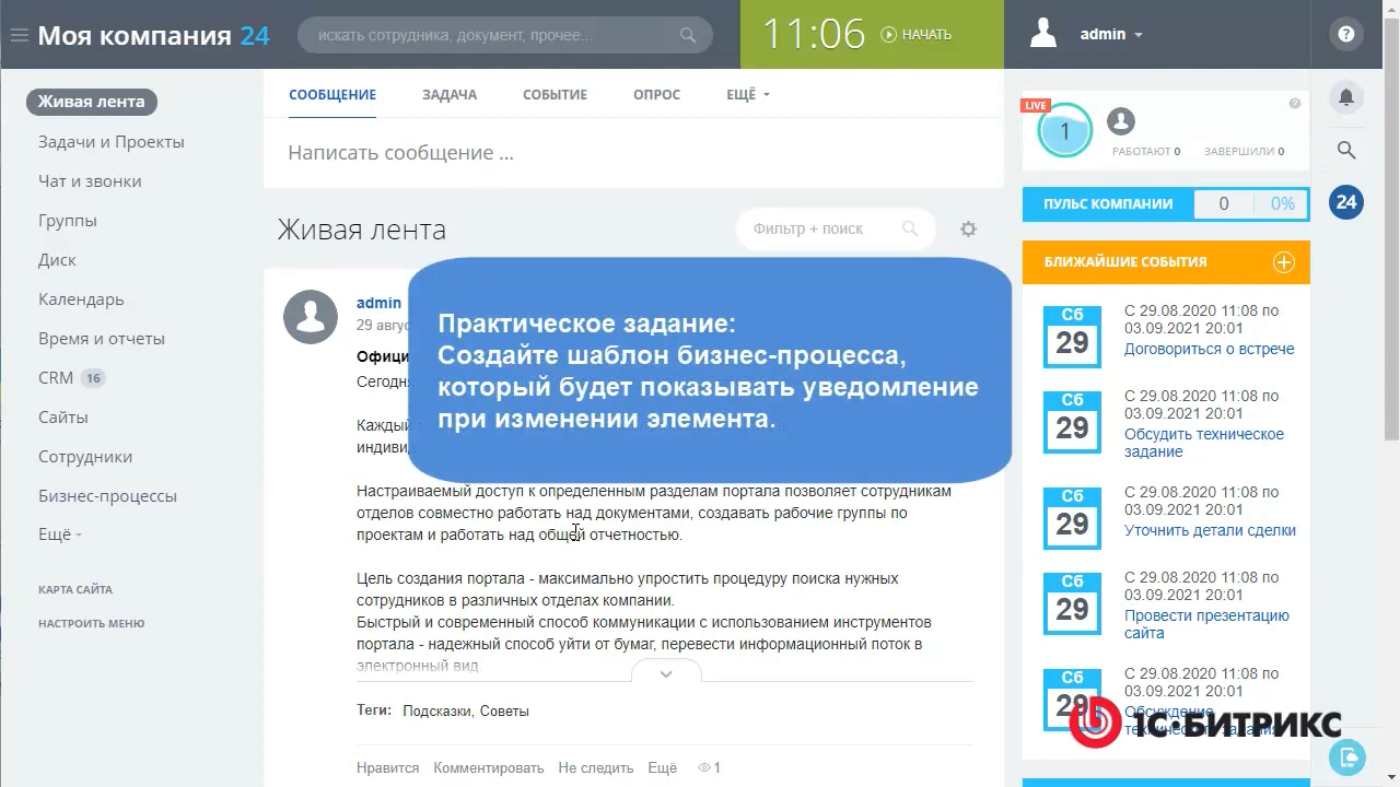 ** видео без голосового сопровождения Решение практического задания № 3.(курс Администратор. Модули, глава Бизнес-процессы)https://dev.1c-bitrix.ru/learning/course/index.php?COURSE_ID=41&LESSON_ID=20262&LESSON_PATH=3911.4549.20262