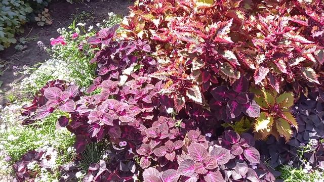 Разноцветные колеусы на садовой клумбе