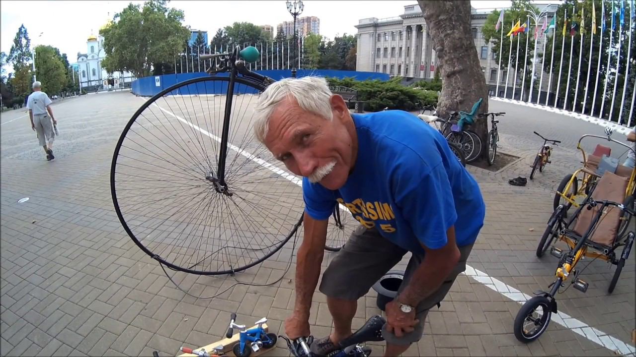 Сергей Дашевский из Краснодара катается на самом маленьком велосипеде в мире, сделанном собственными руками! Размер велосипеда 12 см.. Sergey Dashevsky from Krasnodar rides the smallest hand-made bicycle in the world!