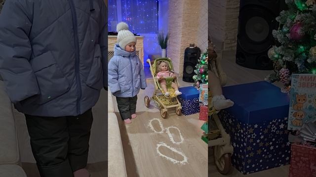 Папу с Анжелиной отправили погулять, а я с Эвелиной сделали из муки следы Деда Мороза и подарки поставили у ёлки .