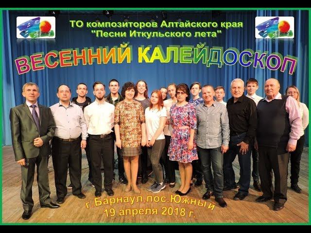 Программа концерта «Весенний калейдоскоп» 19 апреля 2018 г. Дворец культуры «Южный» г. Барнаула Ведущая и автор программы Анна Анатольевна Лакиза 00.00.35. «Сквозь горизонт», муз. Юрия Леонова, исполняет народный оркестр эстрадно-духовой музыки «Мажор» имени Олега Юрьевича Майорова, руководитель Юрий Леонов (г. Новоалтайск) 00.04.30. «Шотландская рапсодия», музыка Юрия Леонова 00.08.45. «Вернись ко мне, моя любовь», музыка Дж.Сороса, аранжировка Юрия Леонова 00.12.50. «Вдоль по Питерской» 00.15.38. «Озорные малыши», муз. Эльдара Багирова, стихи Екатерины Дробышевой исполняет младшая группа образцового театра эстрадной песни «Созвездие» Дворца культуры «Южный» г. Барнаула, художественный руководитель Екатерина Дробышева 00.18.30. «Родимая сторонка», музыка Валерия Никифорова, стихи Анастасии Шипуновой исполняет Анастасия Шипунова (Троицкий район) 00.22.10. «Ничего не случится» автор и исполнитель Сергей Свирин, (г. Барнаул) 00.25.30. «Тишина», муз. Валерия Никифорова, стихи Юрия Чернышова, исполняет Андрей Неустроев (Троицкий район) 00.29.25. «Я лечу», муз. и стихи Евгении Шутовой исполняет автор Евгения Шутова (г. Новоалтайск) 00.32.35. «Майские ночи», музыка и стихи Геннадий Плотникова исполняет автор Геннадий Плотников (г. Барнаул) 00.36.10. «Лирическая кадриль», исполняет Заслуженный коллектив Алтайского края, народный ансамбль народной музыки «Жалейка» Дворца культуры «Южный» г. Барнаула, художественный руководитель з.р.к. РФ Сергей Десятов 00.38.35. «Донской казак в кубанке залихватской» - музыка Александра Куценко, стихи Александры Светловой, исполняют Татьяна Белоносова, Александр Куценко (г. Барнаул) 00.42.00. «Колышки», музыка Юрия Чернышова, стихи Нины Ощепковой, исполняет автор Юрий Чернышов 00.45.45. «Подарок» музыка и стихи Евгении Шутовой, иполняет автор, Евгения Шутова 00.48.15. «С колоколен высоких», стихи Сергея Климова, музыка Сергея Мышкина, исполняет Сергей Мышкин (г. Барнаул) 00.51.51. «Любимая», музыка и стихи Игоря Пергаева, исполняет автор Игорь Пергаев (г. Барнаул) 00.56.35. «Самба», исполняет народный эстрадный ансамбль «Родник», руководитель Валерий Никифоров, соло на аккордеоне Нина Сизикова 00.58.50. «Весёлое настроение», музыка Валерия Никифорова 01.01.15. «По холодной траве», музыка Геннадия Городилова, стихи Елены Безруковой, исполняет Геннадий Городилов (с.Санниково,Первомайский район) 01.03.30. «Моя Сибирь», Сергей Десятов народный ансамбль «Жалейка» 01.06.20. «Душою чтобы не стареть», музыка Александра Куценко, стихи Вероники Рождественской, исполняют Татьяна Белоносова и Александр Куценко 01.09.25. «У самого синего моря», исполняет инструментальный дуэт «Лира», Юрий Чернышов, Геннадий Шелехов (Красногорский район) 01.11.11. «Волк», стихи муз.Валерия Тюрина, исполняет Павел Городилов 01.14.20. «Лебедем белым», музыка Юрия Чернышова, стихи Галины Захаровой,исполняет Людмила Мотовилова (Красногорский район) 01.18.14. «Дети солнца», авторская песня Игоря Пергаева 01.21.57. «Погода-непогода», музыка Геннадия Городилова, стихи Эльвиры Красновой, исполняет Геннадий Городилов 01.25.27. «Где моя любимая живёт», музыка Геннадия Городилова, стихи Сергея Прокофьева, исполняют Павел и Геннадий Городиловы 01.28.35. «Люди-птицы», музыка и стихи Юрия Леонова, исполняет Сергей Леонов 01.33.23. «Души», музыка и стихи Юрия Леонова, исполняет Сергей Леонов 01.36.20. «Дом на холме», музыка и стихи Юрия Леонова, исполняет Юри