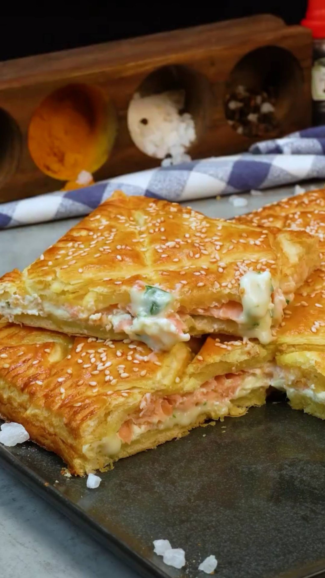 Самая любимая закуска на 8 марта! Рецепт за 5 минут, с небольшим количеством ингредиентов Ингредиенты слоеное тесто: 800 г сливочный сыр с зеленью: 200 г копченый лосось: 200 г яйца : 1 шт кунжут : 50 г Дополнительно сливочное масло: 20 г чеснок : 10 г мука: 30 г сливки : 200 г петрушка : 20 г пармезан: 30 г соль: 3 г черный перец: 3 г Music: www.bensound.com Royaty Free Music: https://www.bensound.com License code: R8B3Q6F46SWLKTTS