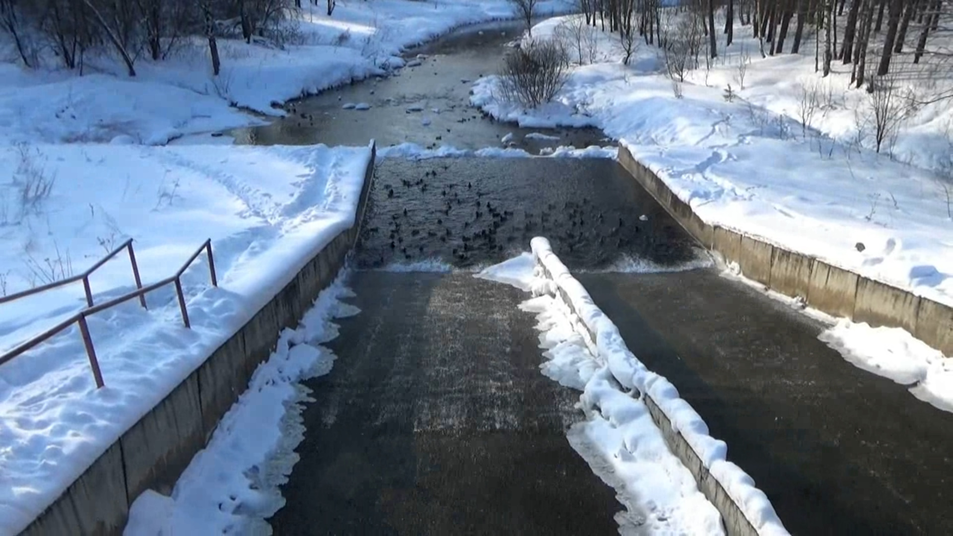 Плотина на реке Талка в Иваново и много уток среди зимы