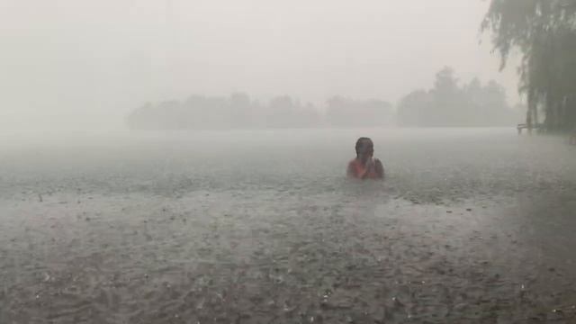 Купальщица в природной воде под дождем.