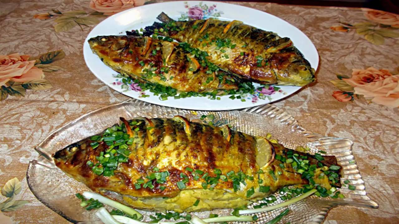 КАРАСИ ,ЗАПЕЧЕННЫЕ В ДУХОВКЕ, С ИКРОЙ И ЛУКОМ