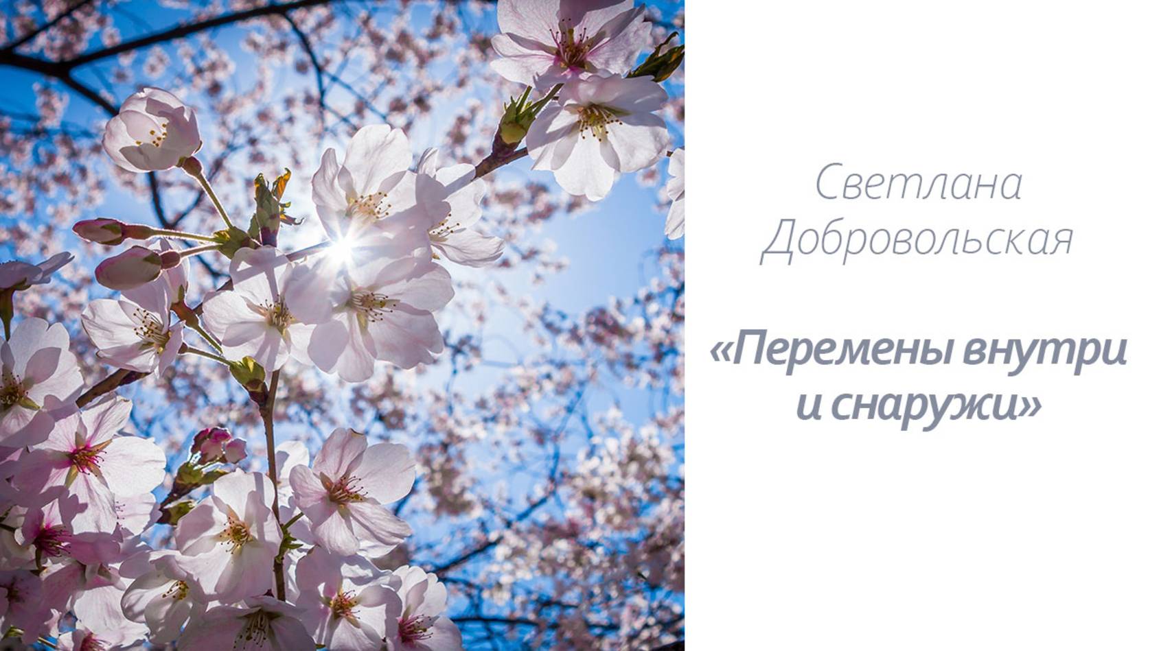Аудиозапись статьи "Перемены внутри и снаружи" - https://obretenie-sily-lubvi.ru/novye-yenergii/peremeny-vnutri-i-snaruzhi.html ----- Добро пожаловать на сайт «Обретение силы Любви» - https://obretenie-sily-lubvi.ru Канал Телеграм - https://t.me/obreteniesilylubvi Группа Вконтакте - https://vk.com/obreteniesilylubvi Канал Яндекс Дзен - https://zen.yandex.ru/id/601bc04142eff0691b1a1305 Канал Рутуб - https://rutube.ru/channel/25783430/ Семинары в Яндекс Музыке - https://music.yandex.ru/album/25917969 Платформа - https://plvideo.ru/@SvetlanaDobrovolskaya/videos
