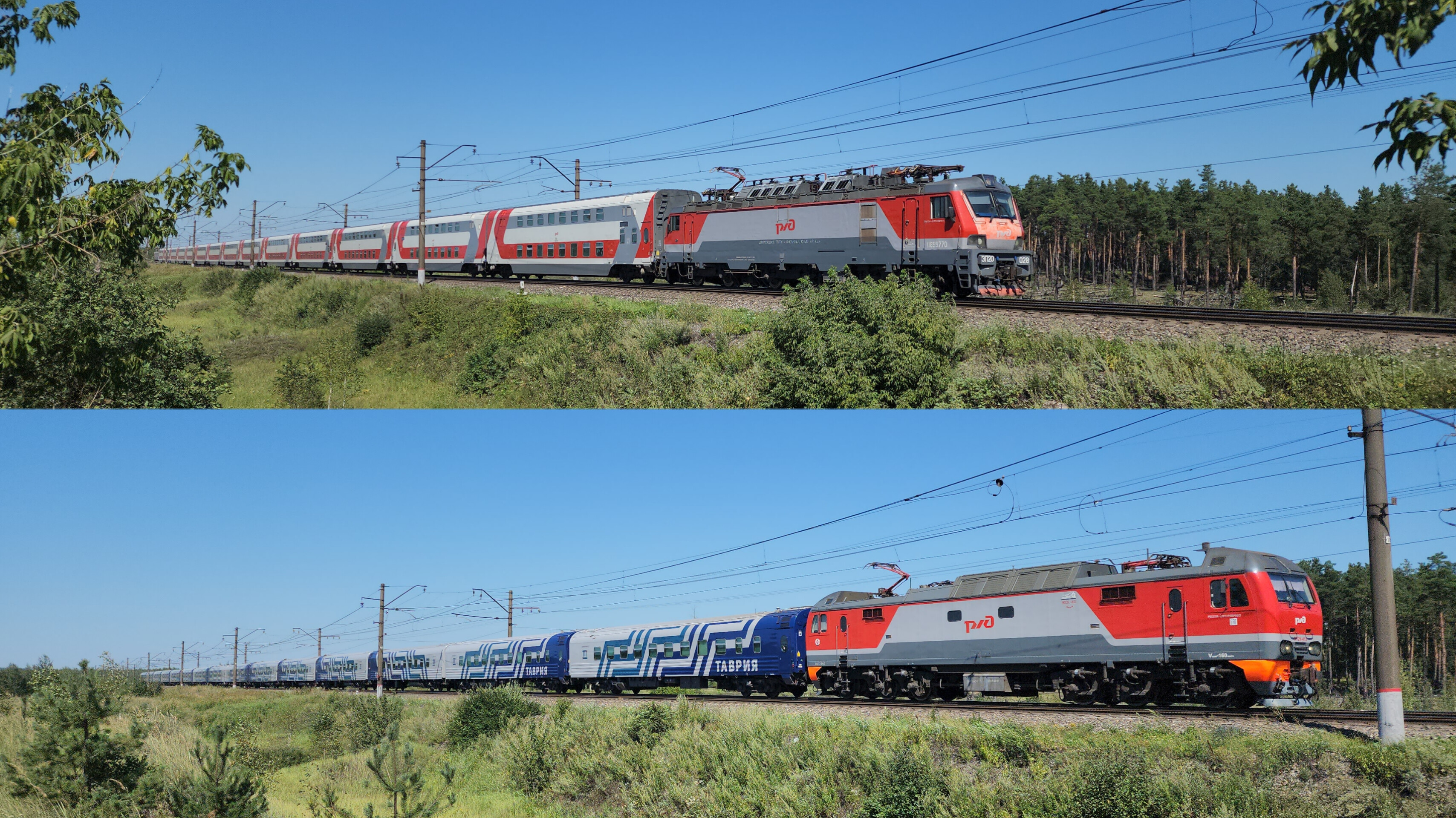 7 августа 2023 года у водного станции Луховицы Московская железная дорога 0:00 - ЭП20-054 пролетает с поездом №12 Москва-Анапа в 12:14 0:27 - ЭП20-028 с поездом №104 "Московия" Москва-Адлер (вагоны габарита Т) в 12:23 0:55 - ЭП20-034 с поездом №737 Воронеж-Москва в 12:27 1:44 - ЭП20-024 с поездом №152 Москва-Анапа подлетает в 12:31 2:10 - ЭП20-065 с поездом №69 Липецк-Москва в 12:36 2:47 - ЭП2К-412 с поездом №160 "Таврия" Москва-Симферополь в 12:44