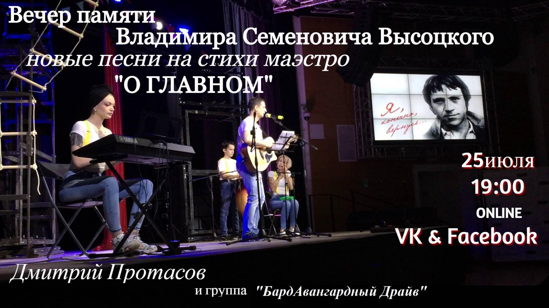 Это запись онлайн - концерта от 25 июля 2020 года Прозвучат абсолютно новые песни на стихи Маэстро "О ГЛАВНОМ" 1. Проложите, проложите 2. В холода, в холода 3. Свой остров 4. Долго же шел ты, в конверте листок 5. Спасите наши души 6. Песня о двух красивых автомобилях 7. Случаи 8. В народе говорят - стихи (Посвящение Владимиру Высоцкому) 9.Расстрел горного эха Для Вас играет группа "БардАвангардный Драйв" в составе: Данила Протасов - ударная установка , барабан Конго Инна Протасова (младшая) - синтезатор Инна Протасова - варган, маракасы, тамбурин Дмитрий Протасов - музыка, гитара, вокал Душевного вечера и будем помнить Владимира Высоцкого - пока живет Русь!