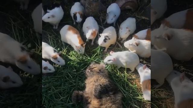 Милый котя и морские свинки чилят на солнышке