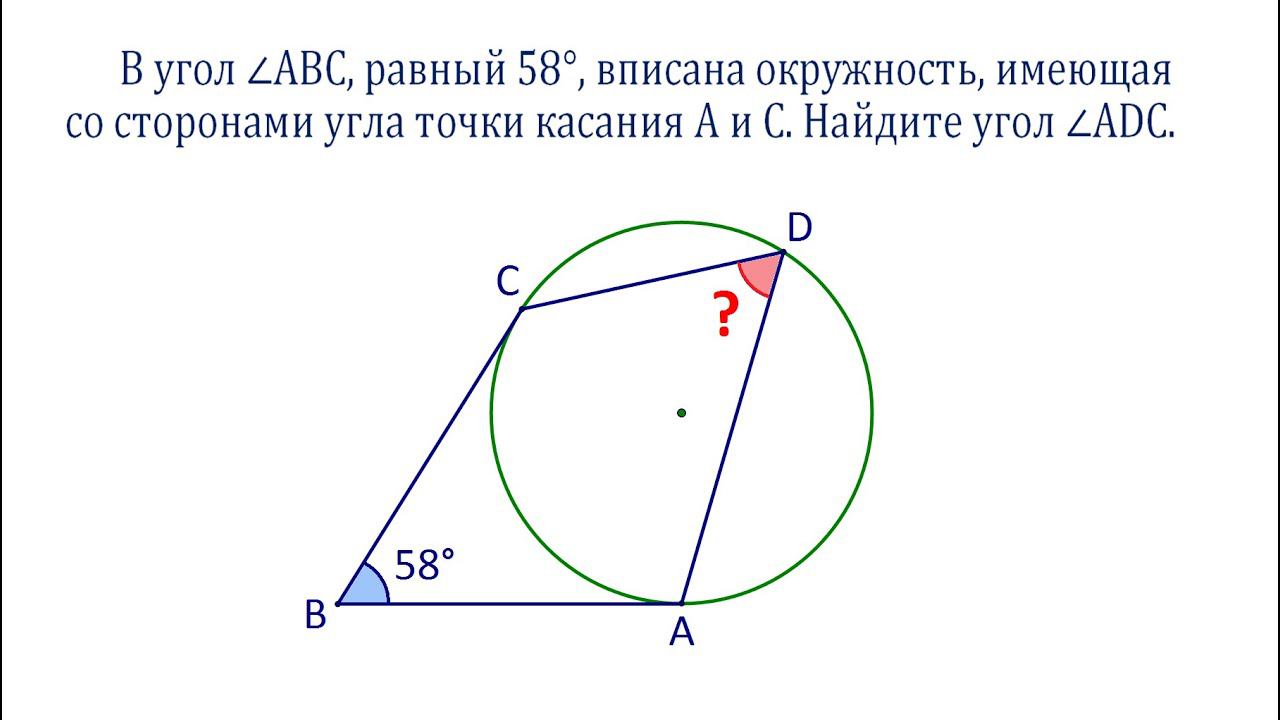 В угол ∠ABC, равный 58°, вписана окружность, имеющая со сторонами угла точки касания A и C. Найдите угол ∠ADC. Предыдущее видео: https://youtu.be/4jIWTFlCjBM Valery Volkov https://www.youtube.com/valeryvolkov @arinablog наш семейный канал https://www.youtube.com/channel/UCktJn2SW0NzKaLkdfsYqnrg Почта: uroki64@mail.ru