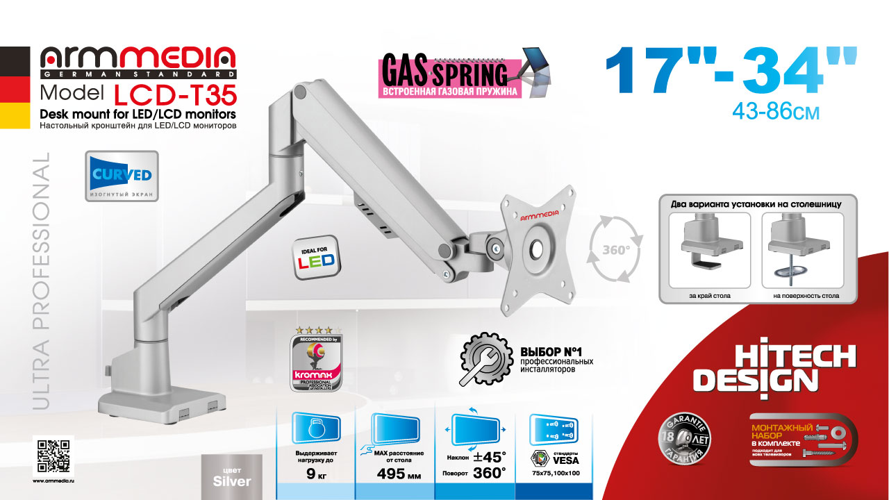 Настольный кронштейн для крепления телевизоров и мониторов ARM MEDIA LCD-T35 SILVER надёжно удержит экран размером 15"-34" дюйма и весом от 1 до 9 кг. Наклонно-поворотная регулировка позволит вращать экран на 360°, наклонять вверх и вниз на ±45°, и поворачивать влево и вправо на 360° – для оптимального угла зрения и удобной посадки. ARM MEDIA LCD-T35 SILVER имеет настольный тип установки с механизмом защиты от падения. Крепёжные отверстия настольного кронштейна ARM MEDIA LCD-T35 SILVER изготовлены по международному стандарту VESA. Кронштейн подходит для большинства мониторов популярных брендов, среди которых Samsung, LG, Sony, Panasonic, Sharp, Toshiba, Dell, ASUS, HP, Acer, BenQ, MSI, Philips, Lenovo, Sceptre, ViewSonic, Gigabyte, AOC, Viotek и других. В комплектацию ARM MEDIA LCD-T35 SILVER входят необходимые для монтажа материалы. Вся продукция обеспечивается гарантийными обязательствами. Подробности: https://www.kromax.ru/produce/the_brackets_for_the_1st_monitor/12994/