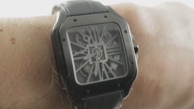 *перевести видео можно в Яндекс браузере Часы Cartier Santos 2019 года выпуска Cartier Santos Skeleton ADLC Noctambule WHSA0009 выполнены из черной нержавеющей стали ADLC толщиной 39,8 мм, обрамляющей люминесцентный циферблат-скелетон на сером ремешке из кожи аллигатора. К особенностям этого большого калибра Cartier Santos относятся скелетонизированный калибр 9612, 72-часовой запас хода, быстросъемный ремешок с быстрым переключением, часы и минуты. Толщина этих часов Cartier также составляет 9,8 мм, а расстояние от выступа до выступа составляет 47,5 мм. Для получения более подробной информации ознакомьтесь с полным обзором Cartier Santos.