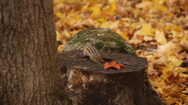 Summer has ended and autumn is in full swing. This time of year is also called fall; can you guess why? It’s because of the falling leaves. Winter is coming, and so the trees shed their old leaves to replace them with new ones in the spring. And on the ground, there is an entire carpet of leaves. Some say this is the most beautiful time of year; I can see why. Look at all the gorgeous colours. It’s an especially beautiful day today. Usually, it gets cold around this time of year; but, today is an unusually warm day. The weather is simply fantastic. This is also a good time of year to see our friends the chickadees and other animals. A chipmunk. They are all busy collecting seeds and other food and storing it for winter. See the chickadee? The chipmunk has big cheeks, and it can fit a lot of seeds in them. It doesn’t eat them right away; it stores them. Look at those big cheeks.