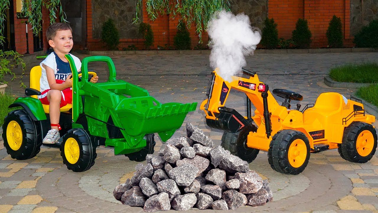 ركوب أرتيم مضحك على حفارة فتح علبة عجلات جرار جديدة Funny Artem ride on Excavator. Unboxing and assembling new Power Wheels Tractor
