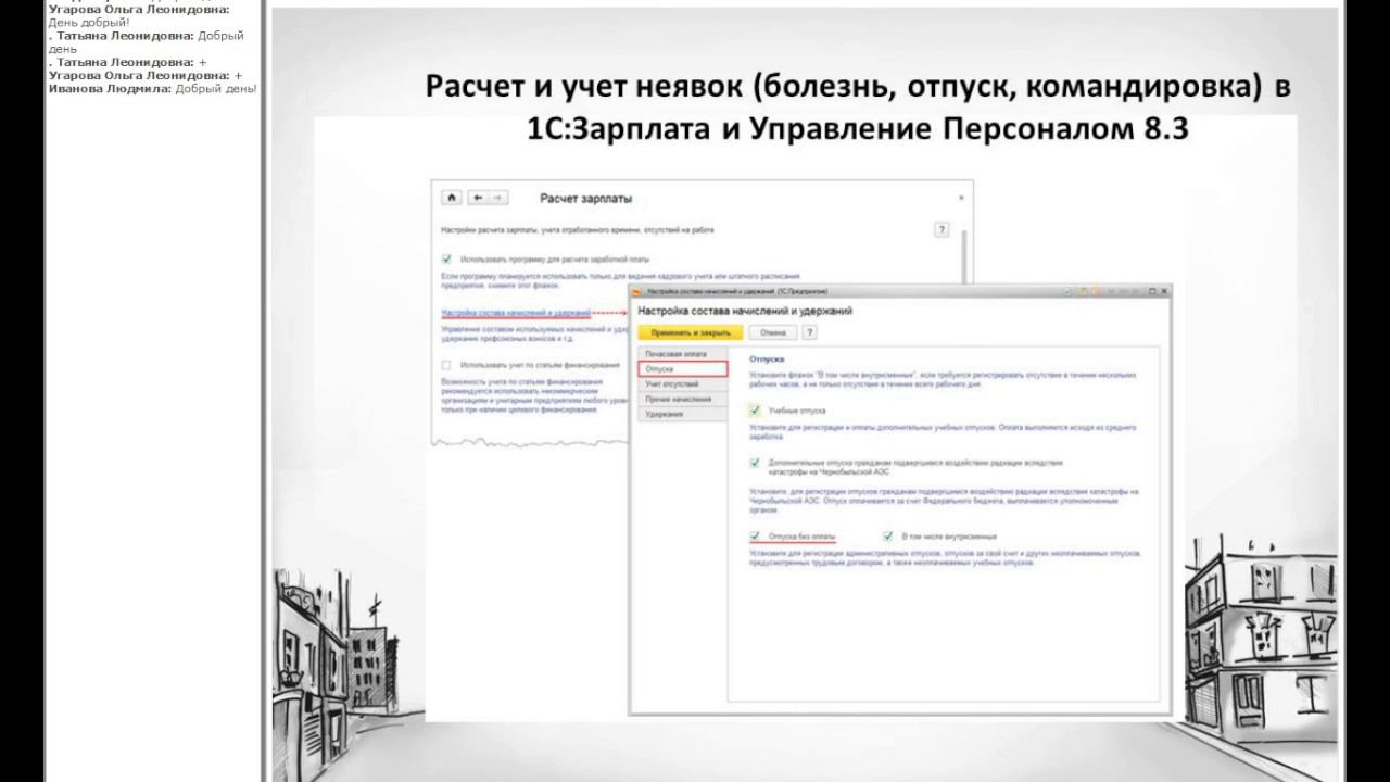 a) Командировки работников b) Отпуска и их оплата c) Начисления отпускных, командировочных и прочих выплат за неотработанное время d) Учет неявок по различным причинам в программе «1С:Зарплата и управление персоналом 8» (ред. 3.0) e) Настройка, учет и расчет в программе отпусков (основного и дополнительных)
