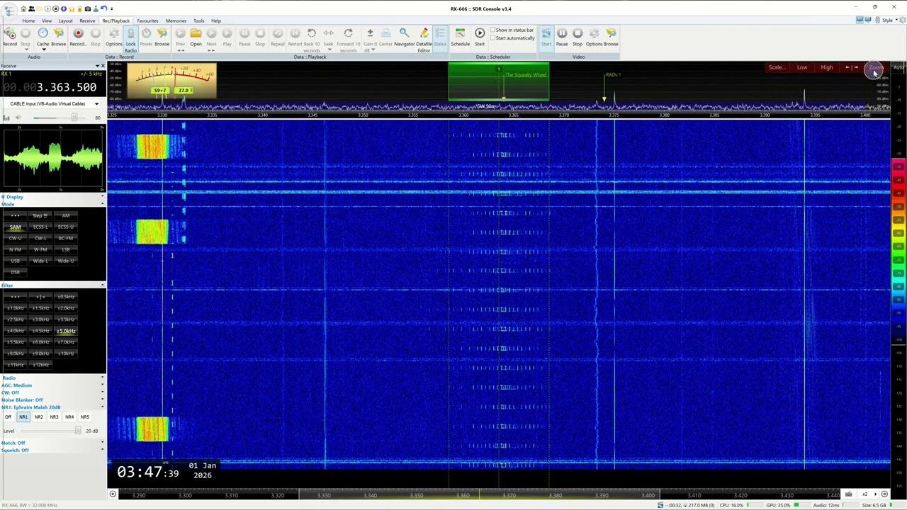 Az ikonikus Nyikorgó Kerék éjszakai frekvenciája és jele. Ez a rádióhallgatók által adott becenév egy rövidhullámú rádióállomást takar, amely jellegzetes hangot sugároz. 2000 és 2008 között az állomás figyelemjelzése egy magas két hangú jel volt, amely hasonlított a kerék nyikorgására. 2008 óta a csatorna markere rövid sorrendben két különböző hangszínre változott. A frekvenciák 5473 kHz (nappali) és 3828 kHz (éjszaka) voltak. Többször is beszámoltak néhány hangüzenetről „Stratégiai Villám üzenetek” formájában. A jelszint Közép-Európában meglehetősen rossz minőségű, így a jel néha több napra eltűnhet a zajfolyamban. Most azért raktam fel, mert szilveszter éjszakája lévén a spektrum nagyon tiszta és zavarmentes volt, így a jel ritka szép és erős volt. A Nyikorgó Kerék az úgynevezett monolitikus hálózat része, és a déli katonai körzet fegyveres erői irányítják, a Капля», «Барон-78» és a «Вега» állomásokkal együtt. A szokásos 5473 Hz és 3828 Hz-es frekvenciák mellett voltak más megfigyelt frekvenciák is, amelyek 3650 Hz, 3815 Hz, 5474 Hz és 5641 Hz voltak. A Nyikorgó Kerék, mint a legtöbb állomás egy monolitikus hálózatban, az úgynevezett csatornajelzőt használja. Jeleznie kell a többi állomásnak, hogy már működik. Ezért úgy tervezték, hogy megakadályozzon más, nálánál erősebb jeleket, amelyek elnyomhatnák a hangüzeneteket. A hangkommunikáció esetében a jelölő le van választva, és a hangüzenetet hangosan felolvassák. A leggyakrabban használt hívójel az Alpha-45. Van egy elmélet, hogy a Nyikorgó Kerék és a Pip összekapcsolt rendszer. Többször megfigyelték, hogy miközben a Nyikorgó Kerék rádió kezelője stratégiai szöveget olvas be a mikrofonjába, a háttérben a Pip hangja hallható. Tehát Nyikorgó Kerék rádiókezelőjének folyamatosan figyelnie kell a Pip jelzéseit. Ez fordítva nem igaz. a Pip rádiókezelője nem figyeli a Nyikorgó Kereket. Az első hangüzenetet, amelyet ma ismernek, 2011. március 16-án rögzítették. Az állomás szerepel az Enigma listáján (rövidítve: ECL) XSW, azaz hangállomásként, de 2005-ben átnevezték S32-re. Az Enigma megnevezés az S32 "S" betűvel van ellátva, amely a szláv nyelvre utal. Hangüzeneteket általában hetente küldenek. A jeladó pontos helye ismeretlen, de vannak olyan javaslatok, hogy Ростов-на-Дону, Rostov-on-Don város közelében található. Ezt azonban hivatalosan nem erősítették meg.