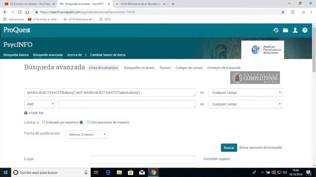 Sesión grabada del curso en línea "Bases de datos de la APA: PsycInfo y PsycArticles". Contenidos: 00:00 Presentación 00:40 Entrar en la base de datos 02:15 Qué es PsycInfo: contenido y cobertura 02:46 Interfaz 05:48 Recomendaciones de uso 06:58 Búsqueda básica 09:43 Búsqueda avanzada 10:50 Búsqueda por materia: el tesauro 20:00 Usar los índices 24:17 Los truncamientos 26:58 Consejos para la búsqueda 30:06 Guardar búsquedas y crear alertas 32:28 Trabajar con los resultados y guardarlos 34:13 Trabajar con un registro concreto 35:30 Acceder al texto completo 37:57 El servicio de préstamo interbibliotecario