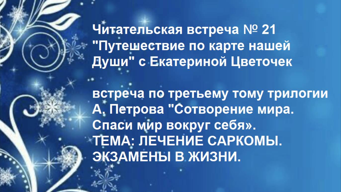Сайт Аркадия Петрова / интернет-магазин: https://kulturabooks.ru Читаем книги по порядку: https://kulturabooks.ru/product-category/knigi-arkadiya-petrova/chitaem-knigi-po-poryadku-glavnaya/ Присоединяйтесь! И познавайте Себя вместе с "Древо Жизни! Мы в Telegram: https://t.me/+HiyUWFMr9jswMWU6 Читательская встреча № 21 "Путешествие по карте нашей Души" с Екатериной Цветочек встреча по третьему тому трилогии А. Петрова "Сотворение мира. Спаси мир вокруг себя». ТЕМА: ЛЕЧЕНИЕ САРКОМЫ. ЭКЗАМЕНЫ В ЖИЗНИ. Продолжаем наше путешествие! Друзья, приглашаем вас на открытые читательские встречи познакомиться с книгами Аркадия Петрова по учению "Древо Жизни"! Читаем, обсуждаем тексты, делаем простую практику по нормированию здоровья и событий. Цель наших занятий совместное проживание смыслов заложенных в книги, благодаря которым многие люди на планете обретают новое миропонимание, оздоравливаются, нормируют события. Встречаемся 1-2 раза в месяц по четвергам, трансляция через ZOOM и группах ВКонтакте НАМ НУЖНА ВАША ОБРАТНАЯ СВЯЗЬ! ДЕЛИТЕСЬ В ЧАТАХ! Telegram основная страница с информацией о предстоящих мероприятиях: Оставайтесь с нами в центре событий! присоединяйтесь к нам в Telegram: t.me/PetrovPushkinoKultura Официальные сайты Аркадия Петрова: https://arkadypetrov.ru https://древожизни1.рф книги: https://kulturabooks.ru ВКонтакте страница Аркадия Петрова: https://vk.ru/a.petrov46 ВКонтакте страница издательства Культура: https://vk.ru/club214534862