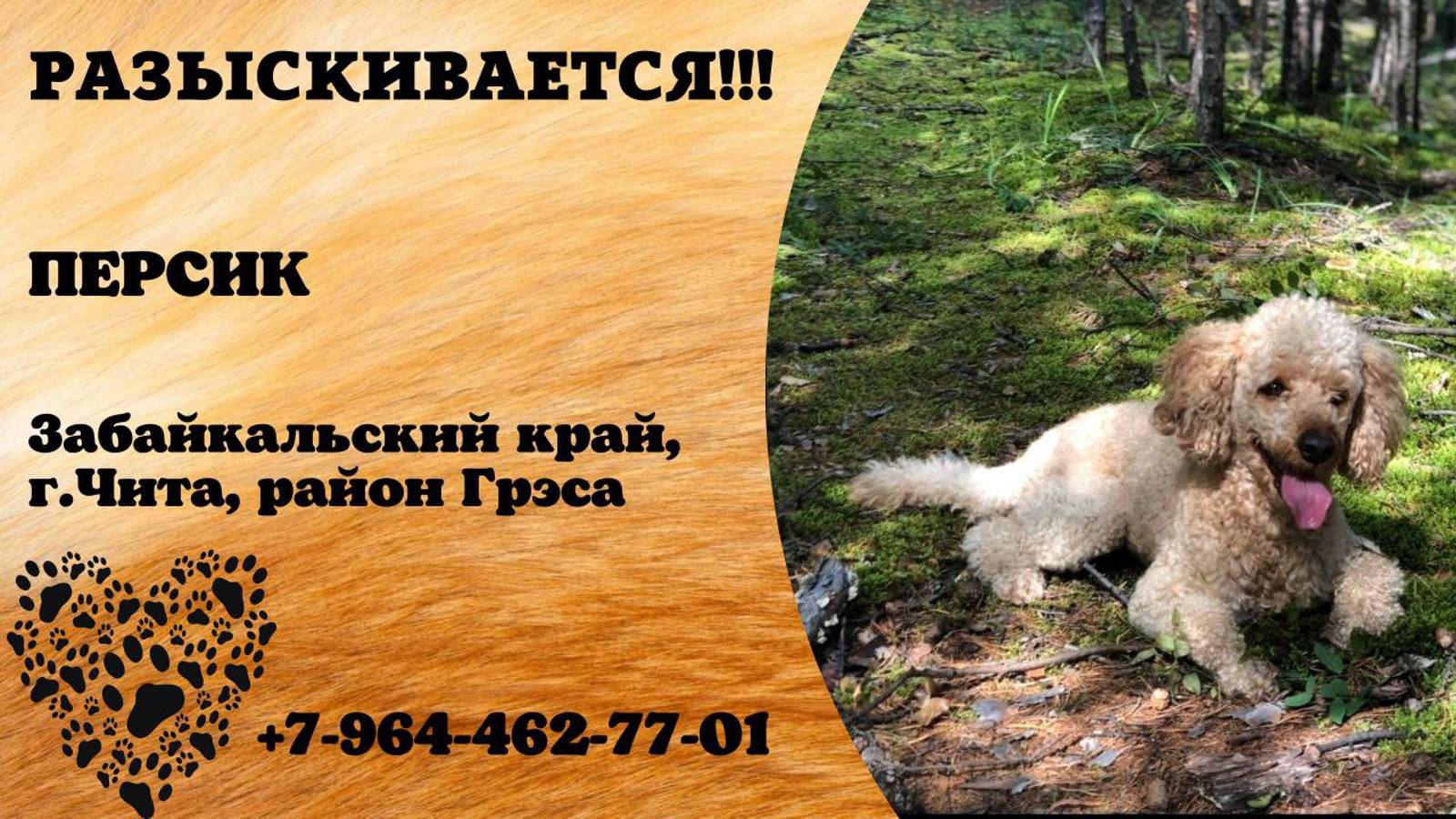 Забайкальский Чита Пропала собака 29 октября утром потерялся средний пудель в районе Грэса, кличка Персик. Просьба нашедших позвонить по телефону 89644627701. Инфо https://vk.com/wall-198815410_158605