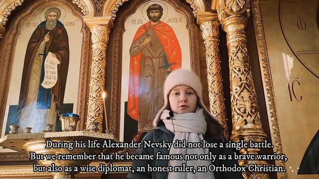 Международный конкурс «Расскажи миру о своей Родине» — проект по патриотическому воспитанию детей и молодёжи и формированию дружественных международных связей между подрастающими поколениями разных стран. «Участвую в конкурсе, чтобы выразить любовь к Родине через историю Александра Невского – небесного покровителя нашего храма, мимо памятника которому мы проезжаем ежедневно. Изучая биографию князя, поразилась его раннему взрослению: в 15 лет он уже правил Новгородом, а к 20 годам одержал победу в Невской битве. Его дипломатическая мудрость (отказ от войны с Ордой ради защиты Руси) и глубокая вера стали для меня открытием. Главной сложностью стал отбор информации: как уместить многогранность подвига в 90 секунд? Помог папа – его поддержка во время съёмок придала уверенности. Работа подарила не только знания, но и внутреннее преображение. Теперь Невский для меня не просто историческая фигура – я чувствую живую связь с человеком, сохранившим Русь в эпоху распрей и нашествий. Его эпоха зеркально отражается в сегодняшних испытаниях. В год 80-летия Великой Победы особенно важно помнить: сила России – в преемственности поколений. Как князь объединял русичей под крестом, так сегодня наши воины защищают ценности предков. История учит: даже в самые тёмные времена находятся те, кто ведёт страну к свету. Александр Невский доказал: подлинная победа начинается с веры в своё дело.»