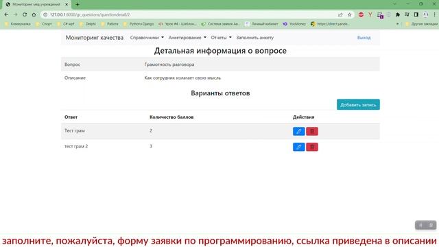 https://kursovik.com/programming/101450409.html Анкетирование качества предоставляемых услуг медицинскими учреждениями. (Python + Django + PostgreSQL) Приобрести исходники(все файлы проекта) данной программы Вы можете, заполнив следующую форму: https://kursovik.com/programming/101450409.html?camefrom=rutube#form Заказать отчёт(описание): https://kursovik.com/programming/101450409.html?camefrom=rutube#pz_need Заказать модификацию: https://kursovik.com/uniform.html?modify=101450409&camefrom=rutube Заказать новую программу: https://kursovik.com/programming_order.html?camefrom=rutube Задать вопрос автору: https://kursovik.com/programming/101450409.html?camefrom=rutube#vopros Наш Телеграм-БОТ для поиска готовых работ по программированию https://t.me/kursovikcom_bot , в нашей базе более 5и тысяч готовых работ, для более эффективного поиска используйте наш Телеграм-БОТ. Список наших готовых работ по программированию: https://kursovik.com/progtopic.html?camefrom=rutube Разработка программ на заказ согласно Вашему заданию: https://kursovik.com/programming_order.html?camefrom=rutube Мы пишем программы практически на всех языках программирования, работаем с различными базами данных, выполняем как мелкие задачки, так и крупные проекты. Разрабатываем и запускаем в работу ЧАТ-БОТы. Обращайтесь - всегда будем рады Вам помочь! Если нужно переписать данную программу на другой язык программирования - обращайтесь - сделаем. Адрес нашего сайта: https://kursovik.com Наши контакты: https://kursovik.com/contacts.html Наша группа ВК: https://vk.com/kursovik (всем подписчикам скидка 5%) Наш Телеграм-канал: https://t.me/kursovik (всем подписчикам скидка 5%) Наш Дзен-канал: https://dzen.ru/kursovik (всем подписчикам скидка 5%) Наш RuTube-канал: https://rutube.ru/channel/41864889 (всем подписчикам скидка 5%) Наш YouTube-канал: https://youtube.com/@kursovik_com (всем подписчикам скидка 5%) (скидки не суммируются :-) #дипломнаяработа #python #django #postgresql