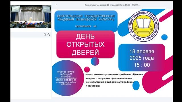 18 апреля 2025 года в 15:00 Волгоградская академия физической культуры приглашает посетить день открытых дверей в формате онлайн!