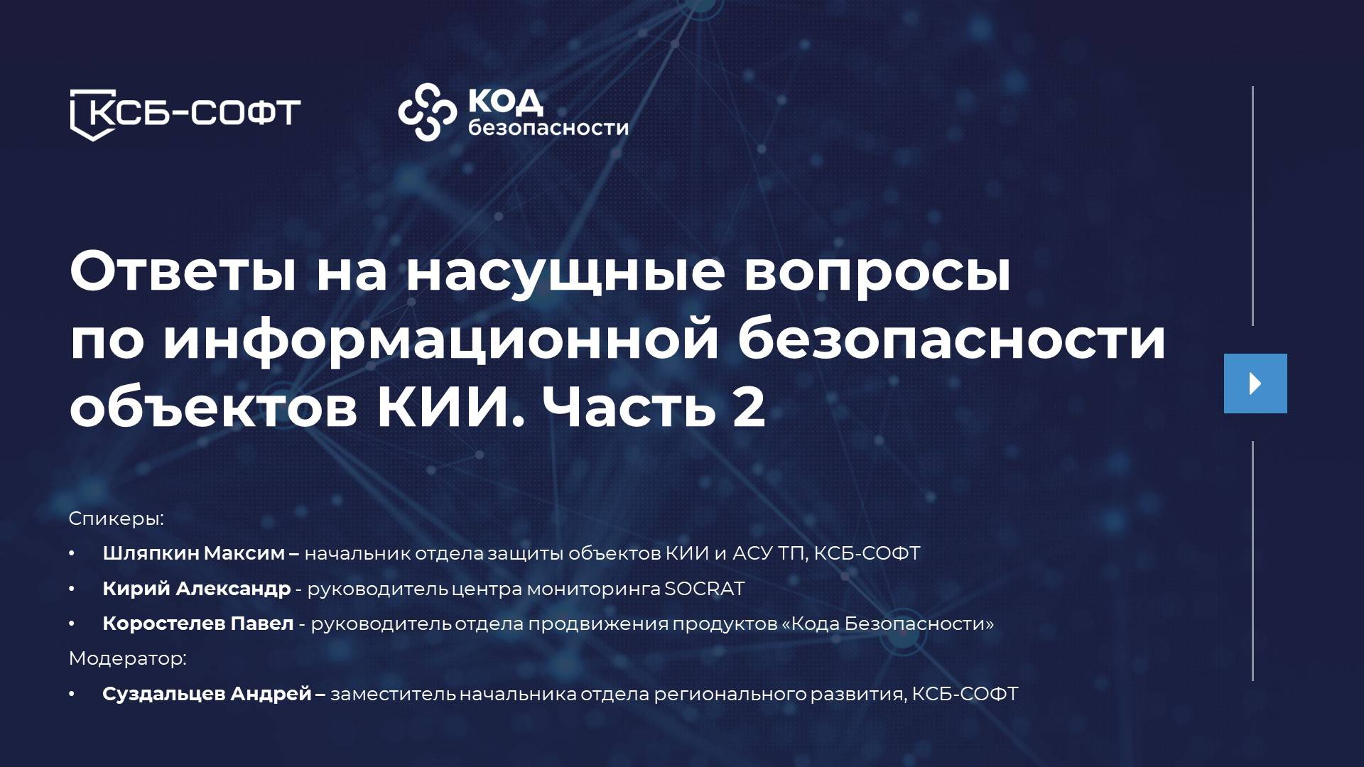 На вебинаре эксперты компании КСБ-СОФТ и Код Безопасности разобрали вопросы по темам: • практическая безопасность КИИ: мониторинг, анализ уязвимостей и тестирование не проникновение; • сетевая безопасность объектов КИИ, защита периметра; • удаленный доступ к значимым объектам КИИ; • компенсирующие меры защиты информации на объектах КИИ; • применение отраслевых перечней объектов КИИ при категорировании; • NGFW «Континет-4» – защита различных типов инфраструктур от малого бизнеса до федеральных сетей. Таймкоды: 00:00:00 - Вступление 00:06:09 - Прокомментируйте, пожалуйста, новые изменения в 127 ПП РФ. Как они повлияют на процесс категорирования? 00:22:29 - Как осуществляется взаимодействие между вашими и нашими специалистами при выявлении инцидента? Как происходит уведомление в нерабочее время? Если инцидент происходит ночью? 00:28:19 - Возможно ли организовать удаленный доступ к ЗОКИИ с помощью СКЗИ? Если да, то как реагируют регуляторы, в частности ФСБ, на применение СКЗИ за пределами контролируемой зоны? Нужно применять дополнительные СЗИ и компенсирующие меры для защиты СКЗИ? 00:34:00 - Если в типовом перечне отсутствует ИС, ее не нужно категорировать или надо привести ближе к типовому объекту? 00:39:49 - Как провести категорирование объектов КИИ из типовых отраслевых объектов, функционирующих в сфере транспорта? 00:43:12 - Какой центр мониторинга выбрать? Построить свой или подключиться к стороннему? Если строить свой центр, то что для этого нужно? 01:00:47 - ЧТо такое доверенные ПАК и попадают ли продукты Кода Безопасности под критерий доверенных ПАК? 01:12:55 - Как регламентировать удаленное подключение к ЗОКИИ? Для удаленного администрирования 01:19:00 - Какие есть гарантии, что пентест будет успешен? 01:22:07 - Какие требования 239 приказа ФСТЭК можно реализовать с помощью Континент 4? 01:27:50 - Как осуществлять удаленное подключение привилегированных пользователей подрядной организации к объектам КИИ? Технические решения и организационные моменты (Юридические нюансы) 01:32:10 - Используете ли вы инструменты соц. инженерии в пентестах? 01:34:23 - Как континент 4 обеспечивает защиту сетей АСУ ТП? 01:35:45 - В организации имеются ЗОКИИ в виде станков в ЧПУ. Какие компенсирующие меры предпринимаются для таких объектов? 01:42:09 - Есть ли результаты независимых тестов пропускной способности Континент 4? 01:49:39 - Ответы на вопросы из вкладки "Вопросы"