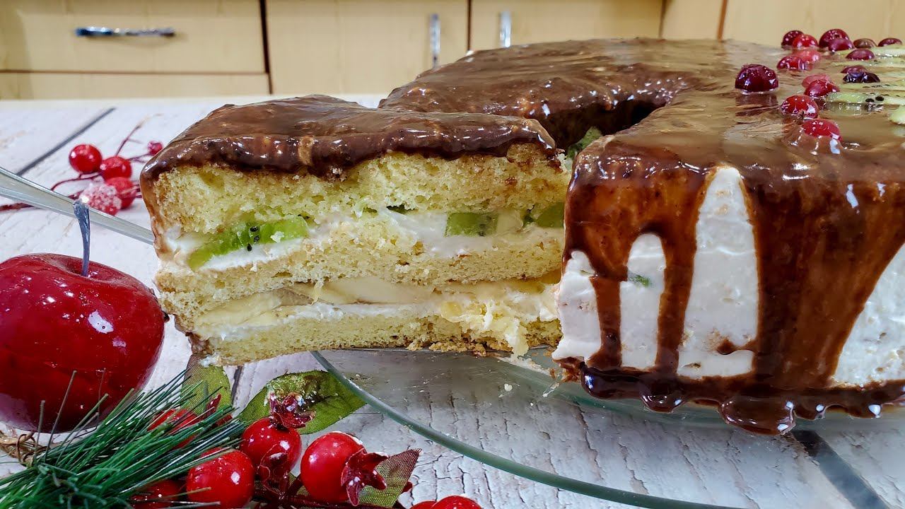 Бисквитный торт со взбитыми сливками и любимыми фруктами