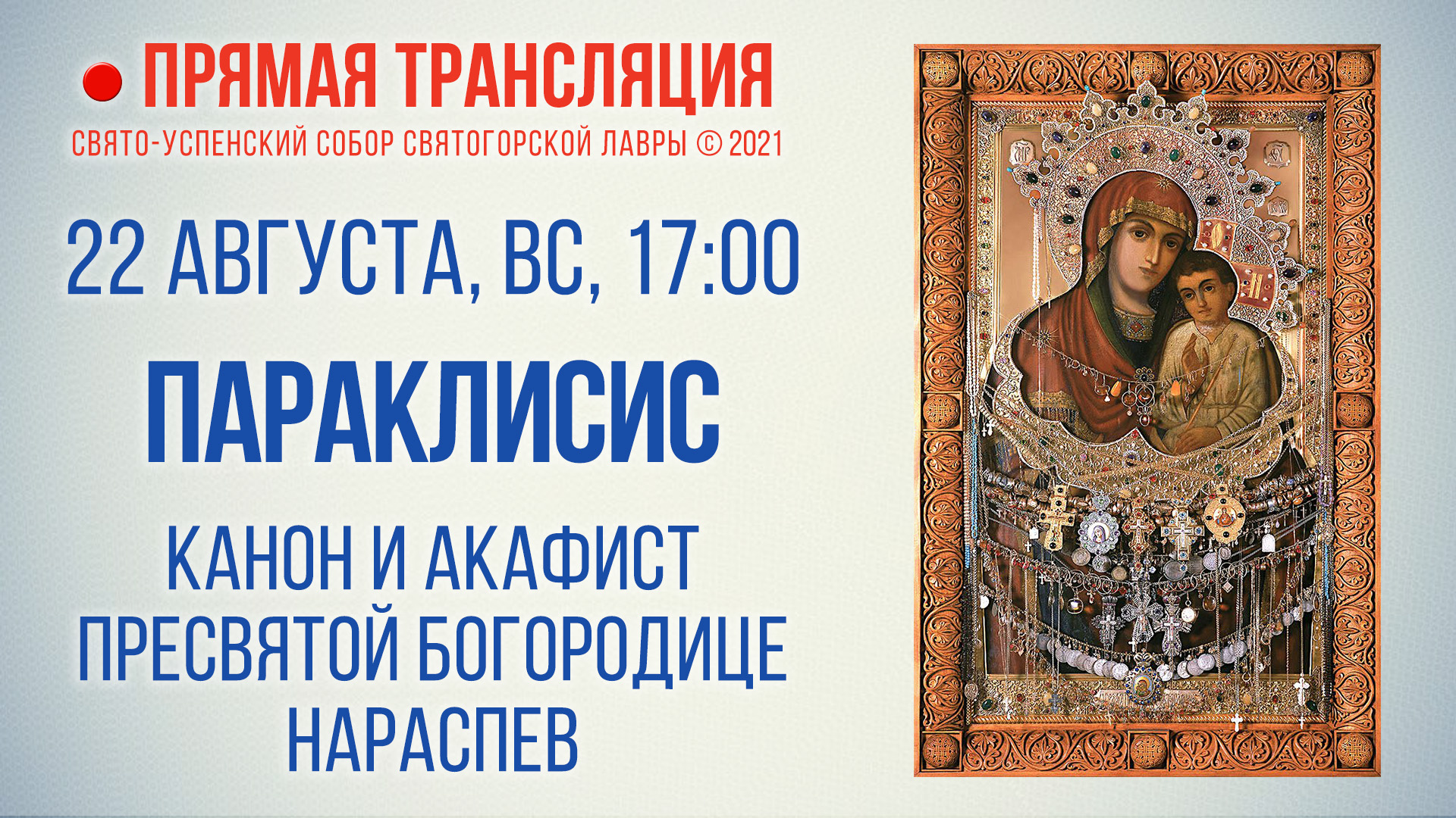 Прямая трансляция. Параклисис. Канон и акафист Пресвятой Богородице нараспев 22.08.2021 г.