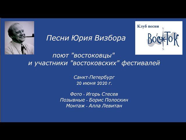Песни Юрия Визбора поют "востоковцы" и участники "востоковских" фестивалей. Санкт-Петербург. 20 июня 2020 г. Фото - Игорь Стесев. Позывные - Борис Полоскин. Монтаж - Алла Левитан. 0:00:35 Вячеслав Вахратимов. Когда придёт мой пароход 0:03:13 Вячеслав Вахратимов. «Вот уходит наше время…» 0:06:32 Вячеслав Вахратимов. Белый снег 0:10:01 Анастасия Симакина. Фанские горы 0:13:19 Геннадий Дёмин. «Мне твердят, что скоро…» 0:15:15 Геннадий Дёмин. Речной трамвай 0:20:29 Мария и Геннадий Дёмины. Вересковый куст 0:24:32 Мария и Геннадий Дёмины. «А зима будет большая…» 0:26:35 Влад Арефьев. «Спокойно, дружище, спокойно…» 0:28:18 Елена Соколова. «Сигарета к сигарете…» 0:30:35 Елена Соколова. Ключ 0:33:32 Елена Соколова. «Лето село в зарю…» 0:35:24 Фёдор Чернокнижный. Песня альпинистов 0:37:13 Лада Полиганова. Памирская песня 0:40:31 Лада Полиганова. Речной трамвай 0:43:27 Сергей Батуев. Сон под пятницу 0:46:02 Сергей Батуев. «Я бы новую жизнь…» 0:49:46 Анастасия Абакшина (Москва). «В Ялте ноябрь…» 0:51:42 Герман Колосов. Вересковый куст 0:55:32 Герман Колосов. Речка Нара 0:57:31 Герман Колосов. Ключ 1:00:53 Лада Вихорева. «Мне твердят, что скоро…» 1:03:11 Лада Вихорева. Радуга 1:06:44 Лада Вихорева. Одинокий гитарист 1:10:01 Лада Вихорева. Воспоминания о пехоте 1:12:51 Андрей Панченко (Москва). Военные фотографии (муз. Сергея Никитина, стихи Юрия Визбора) 1:15:02 Андрей Панченко (Москва). Сретенский двор 1:17:42 Андрей Панченко (Москва). Фанские горы 1:21:15 Екатерина Божева (Москва). «Не греет любовь и не светит…» (муз. Сергея Никитина, стихи Михаила Светлова и Юрия Визбора). 1:24:30 Екатерина Божева (Москва). «Сигарета к сигарете…» 1:27:31 Екатерина Божева (Москва). Вересковый куст 1:31:20 Людмила Андреева и Сергей Воропаев. Погода (муз. А. Поппа). 1:34:20 Сергей Воропаев. Сорокалетье 1:38:55 Валентина Романюк и Сергей Воропаев. Александра (муз. Сергея Никитина, стихи Дмитрия Сухарева и Юрия Визбора) 1:42:19 Мария Чёрная. Долина мечты 1:44:09 Мария Чёрная. Многоголосье 1:46:58 Мария Чёрная. Шереметьево 1:49:06 Валентин Вихорев и группа поддержки. «Увы, мои друзья…» 1:51:45 Валентин Вихорев. «Опять предгорья распахнули руки…» (В. Вихорев)