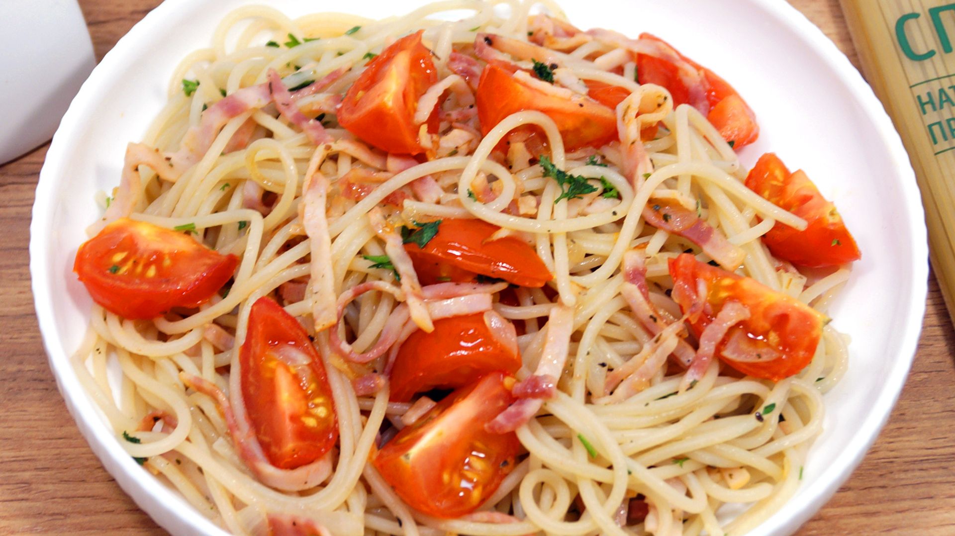 Рецепт приготовления спагетти с ветчиной и овощами. Отличный вариант для тех, кто любит простые, но вкусные блюда. Ветчина добавляет насыщенности, а томаты – яркость, свежесть и витамины. Отличный выбор для семейного ужина! Время приготовления: 30 минут. Ингредиенты: 1,5 литра воды, 250 г спагетти ТМ «Алейка», 200 г ветчины, 3 ст. ложки натурального подсолнечного масла ТМ «Алейка», от щедрых полей Алтая, 5-6 средних спелых помидоров, 1 луковица, 1 ч. ложка соли, 1 щепотка прованских сушеных трав, зелень петрушки по вкусу. Приготовление: 1. Ломтики ветчины нарезать соломкой. 2. Луковицу мелко нашинковать. Помидоры нарезать ломтиками. Зелень петрушки мелко нашинковать. 3. В кастрюле вскипятить 1,5 литра воды. Добавить 1 чайную ложку соли. Добавить 250 грамм спагетти ТМ «Алейка» и варить, помешивая, 8-10 минут на среднем огне до готовности. 4. На сковороде разогреть 3 толовые ложки натурального подсолнечного масла ТМ «Алейка». 5. Обжарить лук 2-3 минуты. 6. Добавить ветчину. Готовить помешивая 2-3 минуты. 7. Добавить 1 щепотку сушеных прованских трав и 1 щепотку соли. 8. Добавить помидоры и готовить 1 минуту. 9. Спагетти откинуть на дуршлаг и дать воде полностью стечь. 10. Горячие спагетти добавить в сковороду и перемешать. 11. Добавить зелень петрушки по вкусу. 12. Разложить по тарелкам. 13. Спагетти с ветчиной и овощами готовы. Можно подавать к столу. Приятного аппетита!