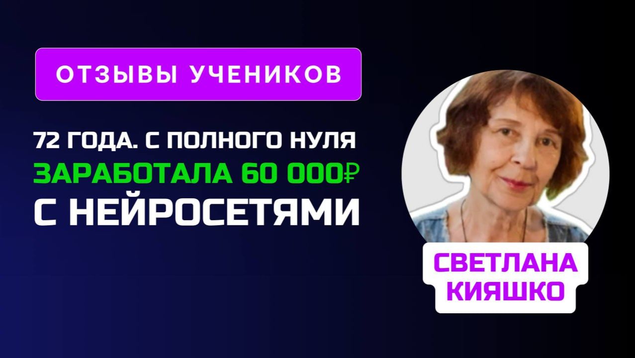 ✅ Если вы хотите зарабатывать с помощью нейросетей, запишись на бесплатный 3-дневный интенсив ➡ https://prodschool-obuchenie.ru/nn-land09-main/?utm_source=baza&utm_medium=youtube&utm_campaign=4He45xuBh0gDwhwmoWyClg 🎬 Видео интервью ученицы по курсу заработка на нейросетях для новичков. Ставьте скорость х1,5-х2, чтобы сэкономить время.Окупил обучение 3 заказами на нейросетях 72 года. Боялась даже написать первое сообщение. А теперь заработатывает 60 000 ₽ на нейросетях — с нуля и через сарафанку Сегодня у нас очень тёплая история. История, в которой есть всё: страх, поддержка, первые шаги, первые деньги и самое главное — возвращение к себе. Это Светлана Кияшко, нашей ученице 72 года. Она пришла на курс, потому что… ей просто стало страшно жить только для других. «Я никогда не жила для себя. Всю жизнь — работа, дети, внуки. Стала бояться оставаться одной. А тут случайно увидела Дмитрия… и поняла — он говорит честно. И решил попробовать». Так начался её путь. 💰 Результат — 60 000 ₽ за 4 месяца на простых заданиях На старте Светлана боялась всего: писать, показывать, выкладывать, отправлять. Но ей помогла дочь — дала первый заказ. Потом подруги, знакомая, ещё одна знакомая… и пошло сарафанное радио. • Первый заказ — 9 000 ₽ • Потом мелкие работы • И в сумме: 58 000 ₽ за 4 месяца, работая в удовольствие, совмещая с семьёй и бытом И самое важное — это не «разовый успех». Это начало. Светлана сама говорит: «Хочу выйти на 100 000 ₽. И выйду». Что она делает? • карточки для Авито • визуалы • контент • графику • тексты (кураторы хвалили!) Хотя по образованию Светлана архитектор и 40 лет не работала по профессии, навык красоты — остался. А нейросети раскрыли его заново. ❤️ Самое сильное в этой истории — не деньги Светлана сказала фразу, ради которой стоит работать каждому сотруднику нашей школы: «Вы вытащили меня из рутины. Теперь я думаю не о своих ошибках в жизни, а о том, как красиво собрать портфолио. Мне 72 — но я хочу и могу зарабатывать» Это то, ради чего мы создаём курс. ✨ И да, это ещё один пример, когда результат дал именно НАШ курс Светлана никогда не училась на онлайн-курсах. И тем более — никогда не думала, что сможет работать с нейросетями. Но: • уроки понятны • подача живая • поддержка настоящая • кураторы не ругали ни разу — только направляли • и самое важное — её перестали пугать технологии. «Школа очень сильная. Всё понятно. Даже я смогла. А молодёжь вообще щёлкнет как семечки» Если вы думаете: «Смогу ли я?» — просто перечитайте эту историю Если у Светланы получилось — справитесь и вы. 📹 Смотрите видео и мотивируйте себя на успех! 📢 Делись видео с друзьями: https://rutube.ru/video/b387e40ad30a7e2c426d105c58102e33/ 📺 Подписывайся на канал: https://www.youtube.com/ДмитрийДьяков1 📌 Группа Вконтакте https://vk.com/prodvizhenie_school 📌 Мой профиль ВКонтакте: https://vk.com/dyakov_d 📌 Telegram канал школы: https://t.me/prodvizhenie_school 📌 Telegram канал нейросетей: https://t.me/pro_ai_novosti 🎬 Другие видео-отзывы наших учеников: ⏩https://rutube.ru/video/a79fe767551548bfa060dc0c62343519/ ⏩https://rutube.ru/video/07ffa8547f9d83c425f653dc99350609/ ⏩https://rutube.ru/video/aa9fd52d5af94e6c696590aafbbe500e/ ⏩https://rutube.ru/video/028be1023442b8f2528c8622142faa5f/ ⏩https://rutube.ru/video/387307f4fe6a8b14e7aeab9e2ab8b9ba/ ⏩https://rutube.ru/video/04ab02a3da262e1cfa303fdf7f3ef29d/ ⏩https://rutube.ru/video/523068f2aea9e21843339bcb35027fb9/ ⏩https://rutube.ru/video/cff3e43f94e28694970d2fe76492d19d/ ⏩https://rutube.ru/video/3f21a4be8b1dc329330f3708abedf299/ ⏩https://rutube.ru/video/b32ddc6e7987f6b519f02bed168d4a12/