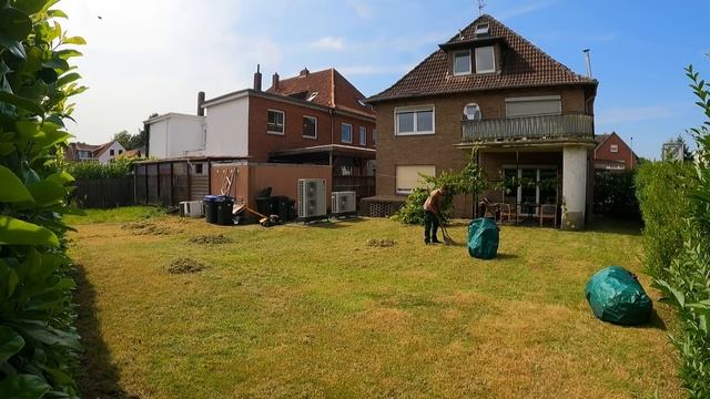 Три месяца назад я подстригал запущенную лавровую изгородь в этом дворе, но из-за сильного дождя не смог записать видео, и теперь клиент снова попросил меня о помощи, потому что рабочий, который регулярно косил газон, больше не приходит, так что трава заросла, а в доме находится пиццерия, и мусор повсюду. Я решил собрать весь мусор, прежде чем начать, потому что пластик и другие отходы не должны смешиваться со скошенной травой, так как все зелёные отходы перерабатываются в компост. Хозяин просил меня просто скосить траву, но я увидел, что тротуар — и снаружи, и внутри двора — зарос сорняками, поэтому с помощью триммера скосил все сорняки. Также во дворе растёт виноград, и он сильно расползся по траве, поэтому мне пришлось аккуратно убрать его лозы, чтобы не повредить. Затем я начал косить газон. Хозяин только попросил меня не косить небольшую площадку, отделённую бордюром рядом с крапивой, так как оказалось, что это заросший огород одного из жильцов, и он планировал там что-то делать. Как обычно, я начал косить газон без травосборника, поскольку высокую траву косить гораздо легче, затем просто собрал всё в зелёные мешки, а потом скосил снова, но уже с травосборником. Когда работа подходила к концу, ко мне подошла бабушка, которая живёт неподалёку. Она попросила меня подстричь большой куст голубого кипариса и выкопать три засохших куста самшита, так как сама сделать это не может. Эта работа не была для меня сложной, но после того как я удалил три куста самшита с корнями, образовались ямы, поэтому мне пришлось сходить в лес, который был рядом, набрать там немного земли, затем выровнять ямы и засыпать их камнями. Эти две работы заняли у меня 4 часа. 06.09.2024