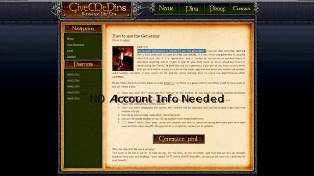 ! -- Updated -`- November 2015! http://GiveMePins.com is a site that allows you to generate RuneScape membership pins for FREE. -No Account information required. -No downloading involved. -No pay by click sites. -No hard work. Just do as the video does, fill in the survey when asked and redeem your pin. If it doesn't work, just try again. To get a working pin you may have to try many times, and the pins don't always work. It's an easy way to get free pins, so it's worth 2 minutes of your time. Do it quickly, and spread the word by telling your friends about the video because JaGex may close it down!