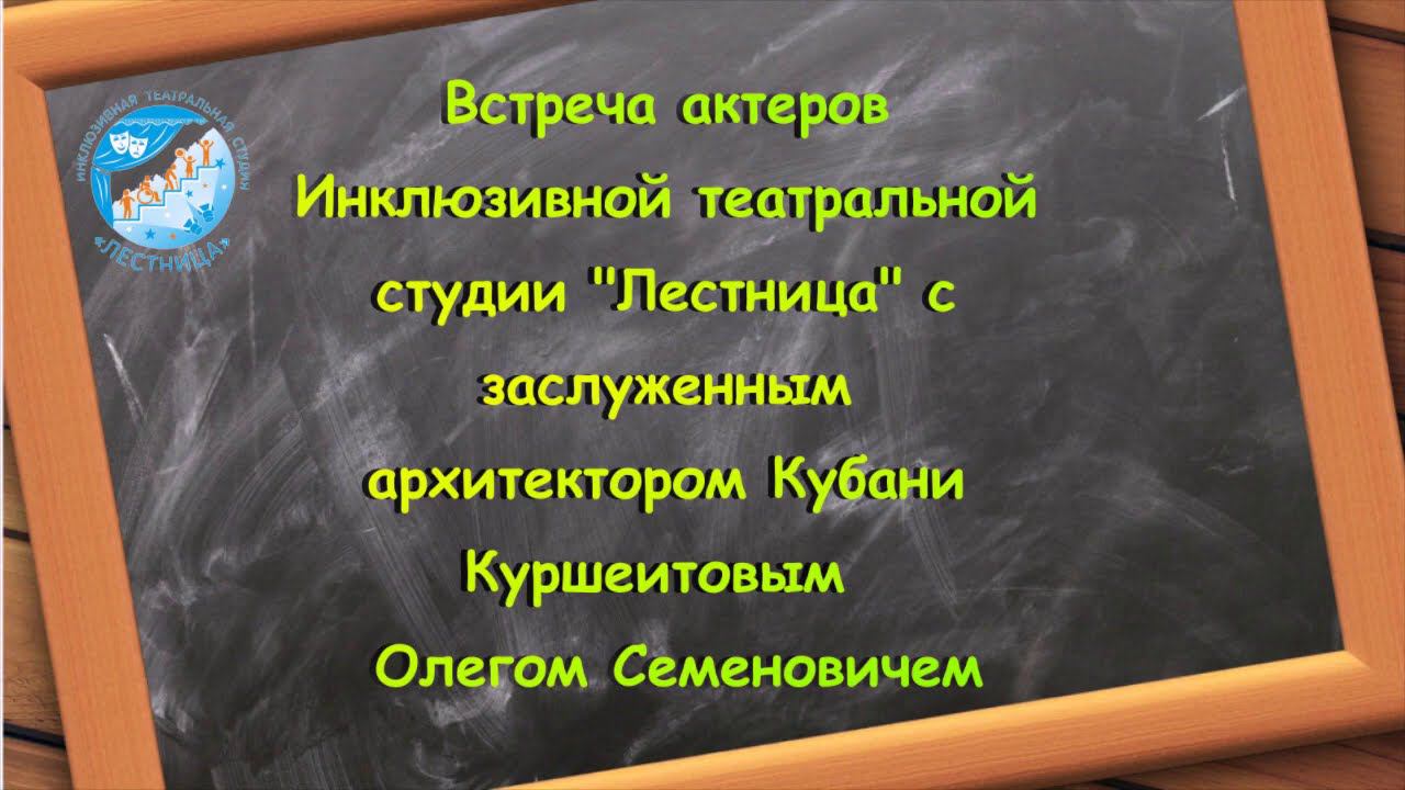 26 сентября 2020г состоялась творческая встреча актеров Инклюзивной театральной студии "Лестница" с заслуженным архитектором Кубани, почётным членом Правления КРОСАР (Краснодарского регионального отделения Общероссийской творческой профессиональной общественной организации «Союз архитекторов России»), лауреатом Государственной премии Куршеитовым Олегом Семеновичем. Благодарим Олега Семеновича за встречу и книги из личной библиотеки , подаренные театральной студии. #итсЛестница #особыетеатры #особенныеактеры #Краснодар #инклюзия #онлайнзанятия #театр #Репетиции #спектакли #фондпрезидентскихгрантов #архитектор