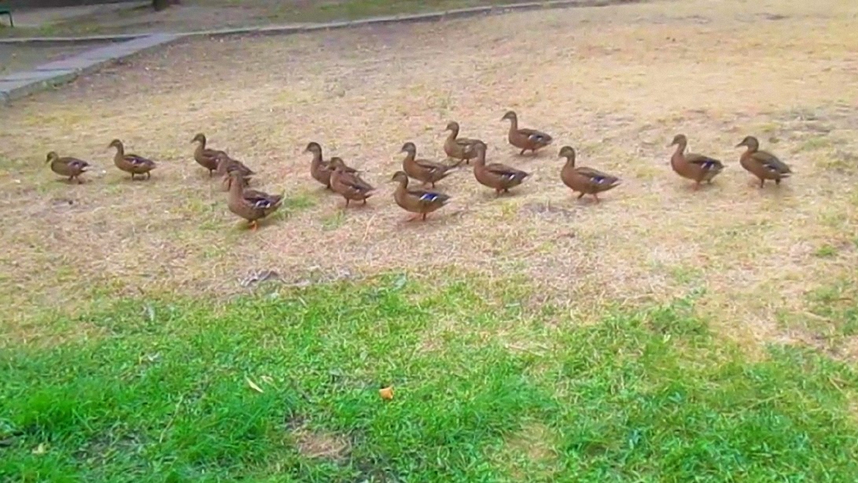 Утки идут на пруд поплавать