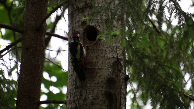 Дятел кормит птенца в лесу.