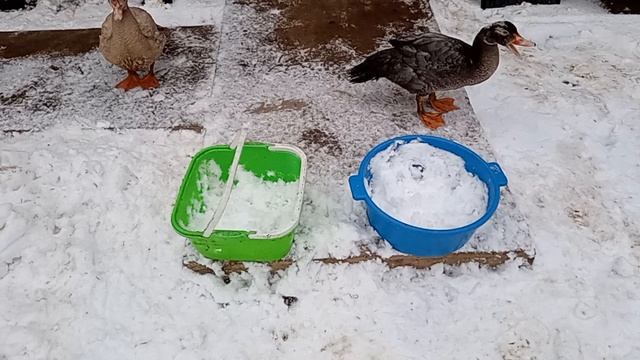 17 ноября 2025 года. Понедельник. Дом у озера. Зима началась. Всю ночь шёл снег. Утром мы вышли уже в зиму. Утки удивлены, утята - тем более. Животные вышли - тоже в удивлении. Вода замëрзла, но мы наливаем уткам тëплой воды из дома - и пить, и купаться. А наша Утя Чудо сидит на крыше. 😊 Вчера я успел доделать стену крольчатника. Все доски убраны под шифер. Летний водопровод убран. Зима пришла. Хотя, на термометре ещё +2°.