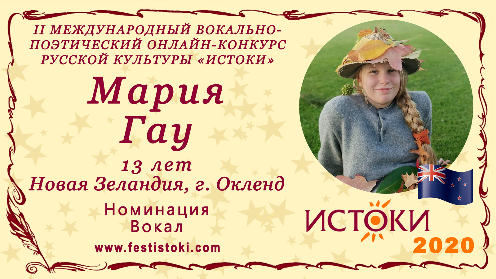 Мария Гау, 13 лет. Новая Зеландия, г. Окленд. "Гляжу в озёра синие"