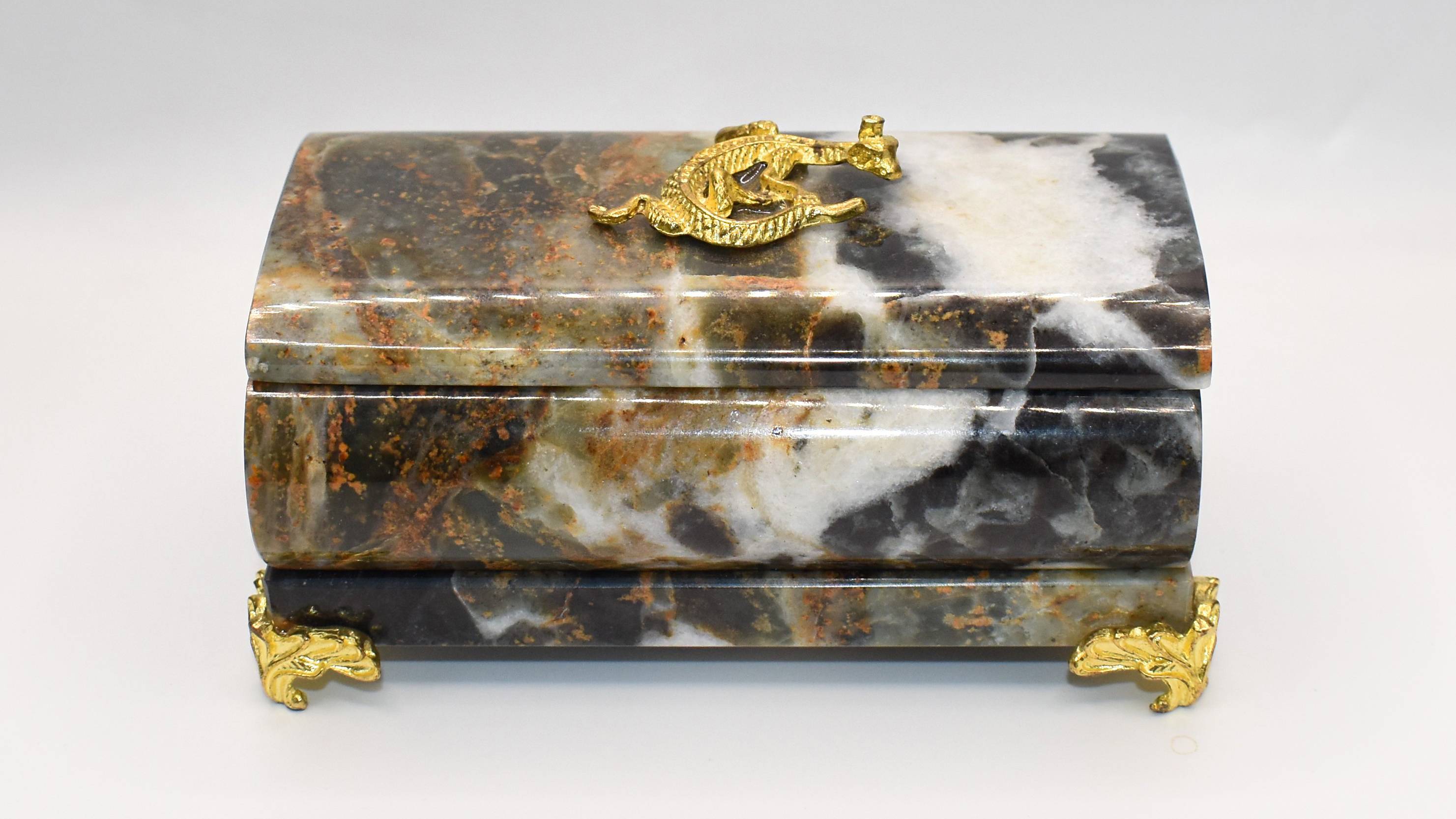 Шкатулка из камня Яшма. Внутри на крышке Змеевик. 100% натуральные камни, без облагораживания. Место добычи камней - Урал. Ножки и ящерка - металлический сплав. Размер: 9,8 х 5,5 х 4 см. Вес: 417 г К686