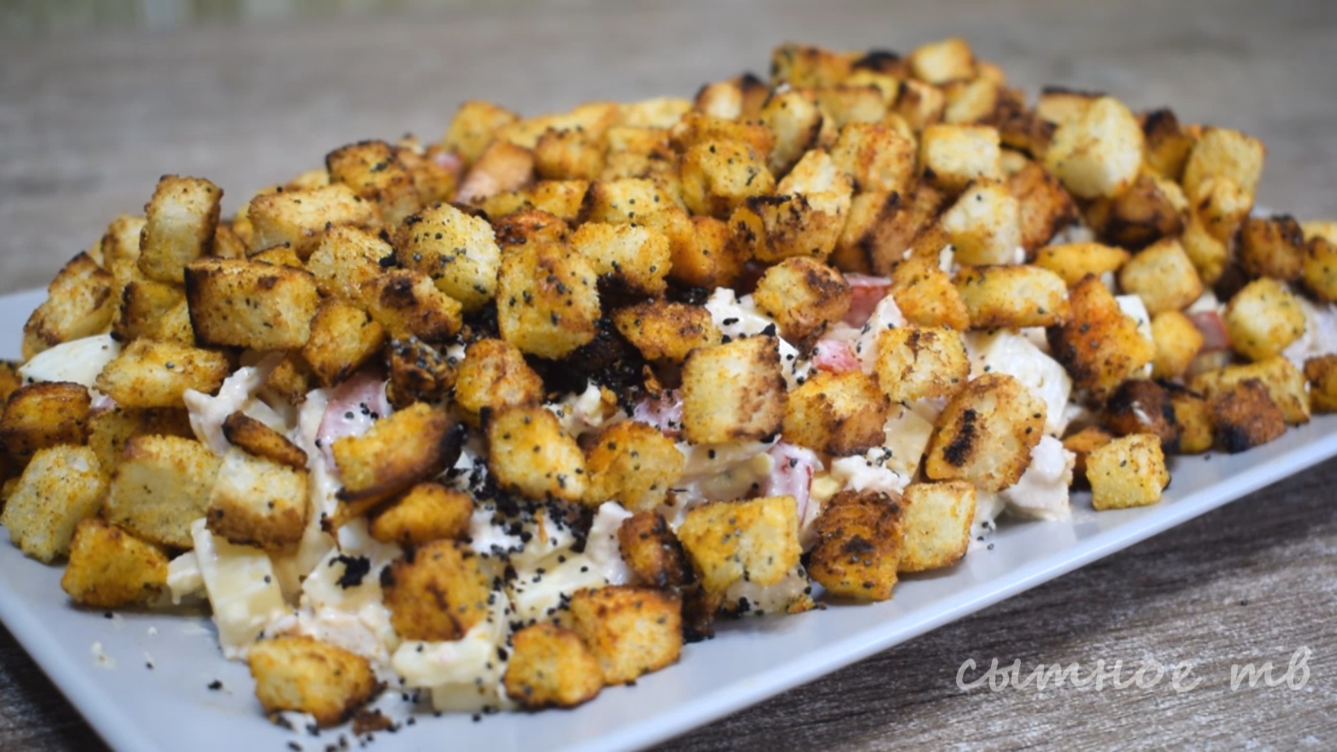 ✅Поддержите меня ракетой (в топ) и комментарием❤️ Этот чудесный салат мы готовим сейчас абсолютно на все праздники! Да и в будние дни тоже! Обязательно попробуйте салат "Курочка под кайфом"! Он действительно очень вкусный! Приятного аппетита! Ингредиенты: копченая грудка - 300гр. помидор-2шт. сыр - 130гр. вареное яйцо - 3шт. майонез - 3ст.л соль по вкусу лимонный перец по вкусу Гренки: батон - 6-7 ломтиков масло растительное - 2-3ст.л чеснок - 2зуб. соль по вкусу перец по вкусу паприка сладкая - 0,5ч.л. мак - 1ст.л. Приготовление: Делаем гренки, батон нарезаем кубиком, обжариваем на растительном масле, посыпаем солью, перцем, натираем чеснок и добавляем паприку, перемешиваем и в конце посыпаем маком. Томаты, яйцо отварное, копченую грудку и сыр нарезаем кубиком. Смешиваем все ингредиенты в большой глубокой миске, заправляем майонезом, посыпаем солью и перцем чили, перемешиваем. Готовый салат выкладываем на тарелку, украшаем гренками. Приятного аппетита ? #салат #рецептсалата #вкусныйсалат #салатскурицей #кулинария #салаты #сытноетв #салатспомидором #салатссухариками #рецептвкусногосалата #вкусноибыстро Мелодия - Sand Castles Автор мелодии - The Green Orbs https://directory.audio/ru/muzyka/detskaya/4067-the-green-orbs-sand-castles