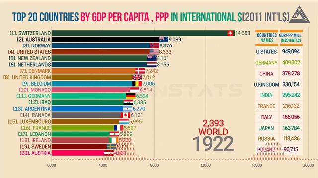 In this Top Richest Countries Bar Chart Race (Bar chart ranking), You will see the complete statistical time series of the Top 20 countries GDP per capita (Gdp per capita ranking) from 1800 to 2040. After Watching this Gdp per capita ranking Bar chart race, You will get: 1-What is the Gross domestic product (GDP) per capita. 1-Historical, Current, and Projection of GDP per capita of the top 20 countries. 2- Top 10 countries ranking by the total GDP. 3-What are the driving factors for a change in GDP growth rate? The gross domestic product per capita, or GDP per capita, is a measure of a country's economic output in a given year, divided by the average or mid-year population for the same year. In this Top Richest Countries video, GDP per capita is converted to international dollars using purchasing power parity rates. An international dollar has the same purchasing power over GDP as the U.S. dollar has in the United States. Economic history is a very simple story. It is a story that has only two parts: The first part is the very long time in which the average person was very poor and human societies achieved no economic growth to change this. Incomes remained almost unchanged over a period of several centuries when compared to the increase in incomes over the last 2 centuries. Almost all that ordinary people used and consumed in the 17th century would have been very familiar to people living a thousand or even a couple of thousand years earlier. Average incomes in England between the year 1270 and 1650 were £1,051 when measured in today’s prices. The second part is much shorter, it encompasses only the last few generations and is radically different from the first part, it is a time in which the income of the average person grew immensely – from an average of £1051 incomes per person per year increased to over £30,000 a 29-fold increase in prosperity. This means an average person in the UK today has a higher income in two weeks than an average person in the past had in an entire year. This is the one transformation that changed everything. Before the modern era of economic growth, the economy worked very differently. Not technological progress, but the size of the population determined the standards of living. In the very long time in which humanity was trapped in the Malthusian economy, it was births and deaths that determined incomes. More births, lower incomes. More deaths, higher incomes. The Industrial Revolution started in England in the 18th century and from there spread to other parts of the world. This Industrial Revolution ended the Malthusian economy and made it possible for a country to leave poverty behind. ---------------------------------------------------------------------------------------------------------------------------------------- Data Source: This whole GDP data compiled by Gapminder, using the below sources: 1- World Bank, World Development Indicators 2-The Maddison Project Database 3-Penn Worl Table 4-Data before 1990, is based on Gapminder's historic estimates by Mattias 5-Lindgren, which mainly uses Maddison data 6-WEO 2019 April revision Additional Source: 1-OWID ---------------------------------------------------------------------------------------------------------------------------------------- ► Credits: Whoosh sound by MinecraftM153: https://freesound.org/s/432557/ Images used in thumbnail from https://www.freepik.com/ ---------------------------------------------------------------------------------------------------------------------------------------- Playlist of "Global stats": https://www.youtube.com/playlist?list=PLiBoen_5ICp5Ix6KAUQz_RU0OggGjCcU3 ----------------------------------------------------------------------------------------------------------------------------- Like us on Facebook;https://www.facebook.com/allinstats Follow us on Twitter;https://twitter.com/allinstats007 Follow us on Instagram;https://www.instagram.com/allinstats/ Visit at our website; www.allinstats.com ----------------------------------------------------------------------------------------------------------------------------- PS: Don't forget to subscribe "All in stats" for more trusted and awesome videos. https://www.youtube.com/channel/UCOwejeL_IMxkFMt9NhZOefA?sub_confirmation=1 #Richest_Country, #GDP_bar_chart_race, #Allinstats,