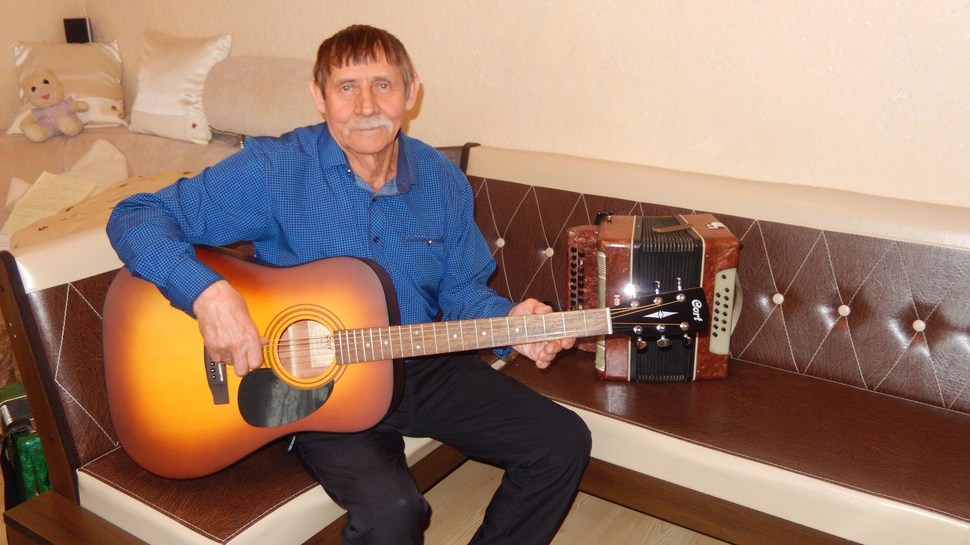 Учиться начал на пенсии, без нот. Самоучка. Репетиция у мужа...Я за кулисами...Смотрит в камеру.