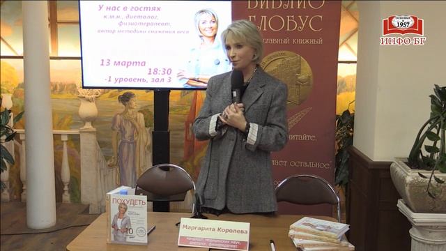 Кандидат медицинских наук, диетолог, физиотерапевт, автор методики снижения веса Маргарита Королева представляет свою новую книгу «Похудеть навсегда. Легкий путь к стройности» http://www.biblio-globus.ru/search/catalog/details/10546439 За последние 10 лет, которые прошли с момента выхода первого издания книги «Похудеть навсегда», мир круто изменился: ухудшилась экология планеты, увеличилось количество стрессовых факторов, изменилась и еда. Продуктовые полки просто ломятся от изобилия вкусной, но в большинстве своем не полезной пищи, рецептура которой переполнена большим количеством различных химических соединений. Неизменным остается одно – авторская научно обоснованная методика снижения избыточного веса доктора Маргариты Королевой, эффективность которой проверена временем и подтверждается результатами. Тысячи успешных случаев исцеления от ожирения и обретения здоровья, тысячи счастливых людей, которые изменили свою жизнь, вернули здоровую стройность и годами поддерживают полученные результаты. Методикой Маргариты Королевой с учетом современных подходов сможете воспользоваться и вы. --- «Библио-Глобус» – старейший книжный магазин в самом центре Москвы и один из крупнейших в Европе. У нас вы можете найти книгу на любой вкус из 200 тысяч наименований. Мы предлагаем широкий выбор изданий на более чем тридцати иностранных языках. Ежедневно мы проводим встречи с вашими любимыми авторами и ждём вас на заседаниях наших читательских клубов по интересам. Все права на настоящие аудио-, видеоматериалы защищены и охраняются законом. Использование материалов без согласия ООО Торговый Дом «БИБЛИО-ГЛОБУС» не допускается. Мы в социальных сетях: VK: https://vk.com/biblioglobus_msk Facebook: https://www.facebook.com/biblio.globus/ Instagram: https://www.instagram.com/biblio.globus/ Twitter: https://twitter.com/Biblio_Globus С любовью, Ваш Библио-Глобус.