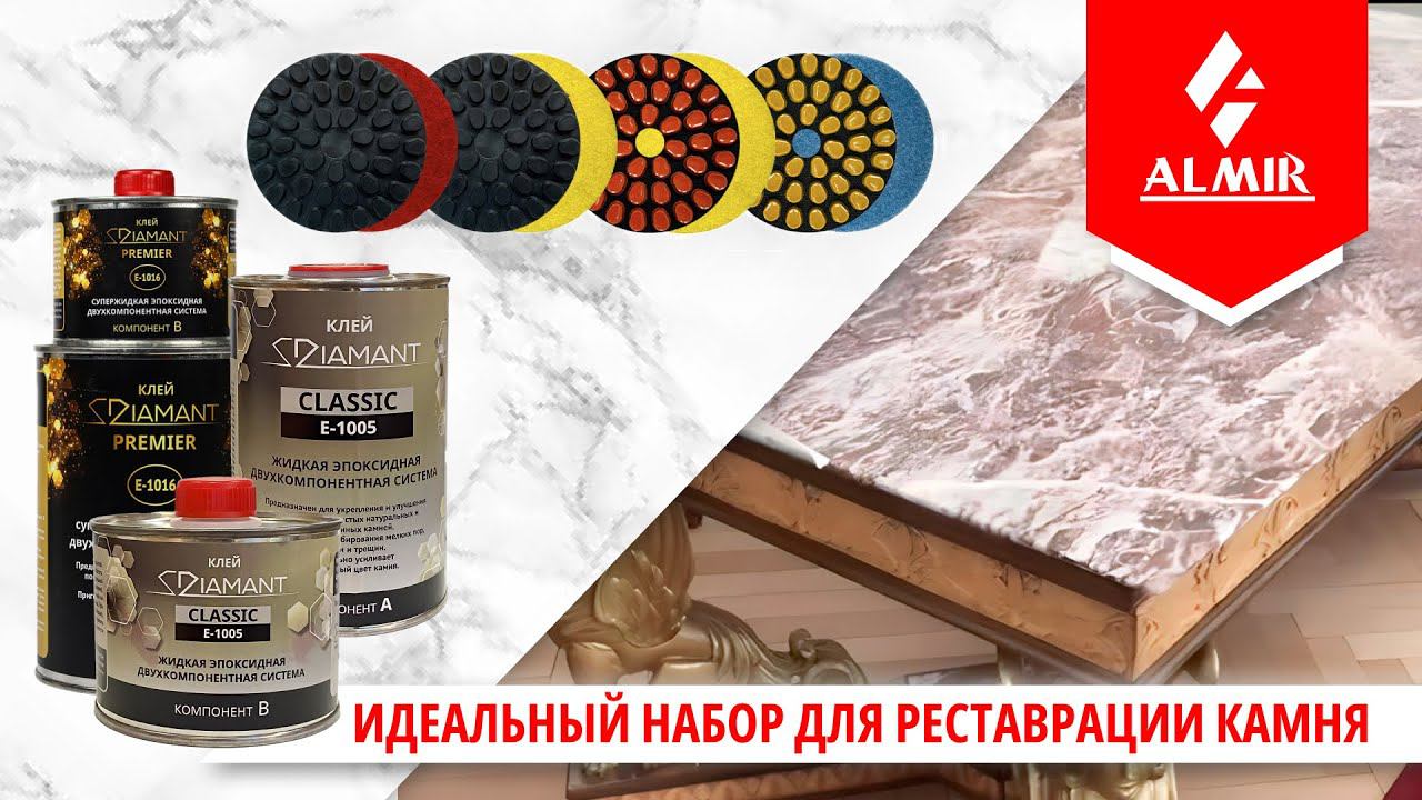 В Компании АЛМИР мы собрали для вас объёмную коллекцию красителей, клеев, мастик и профессиональных инструментов, чтобы вы могли решить любые задачи по достижению нужного оттенка камня, коррекции цвета и реставрации. Спешим поделиться положительным опытом по реставрации антикварной столешницы у одного очень уважаемого человека. Сложность задачи определялась тем, что изделие уникальное, из какого-то редкого мрамора, который больше не добывается и трепетным отношением клиента к этому артефакту. Для работы нам пригодились клеи 1005 и 1016 отечественного производства и набор АГШК MR-FLAT. Результат порадовал и нас, и заказчика. В таких случаях заработок не перекрывает рисков и стрессов, но удачный финал очень вдохновляет и лишний раз подтверждает качество продукции, которую мы поставляем. 1) Диски алмазные MR-Flat для полировки мрамора Ø100 мм, Велкро, с водяным охлаждением, для плоскостей: https://almir.com/market/shlifovka_i_polirovka_plit_i_izdelij_iz_kamnya/instrument_dlya_kamnya_rashodnye_materialy/almaznye_gibkie_shlifoval_nye_krugi_i_aksessuary/diski_almaznye_mr-flat_dlya_polirovki_mramora_100_mm_velkro_s_vodyanym_ohlazhdeniem_dlya_ploskostej/ 2) Жидкий клей эпоксидный двухкомпонентный ДИАМАНТ PREMIER, бесцветный, 1 кг: https://almir.com/market/himiya_dlya_kamnya_i_betona/sklejka_kamnya/poliefirnye_mastiki_i_shpatlevki_epoksidnye_i_drugie_klei_dlya_kamnya/zhidkij_klej_epoksidnyj_dvuhkomponentnyj_diamant_premier_bescvetnyj_1_kg/ 3) Жидкий клей эпоксидный двухкомпонентный DIAMANT CLASSIC E-1005 (Диамант Классик), бесцветный, 1,25 кг: https://almir.com/market/himiya_dlya_kamnya_i_betona/sklejka_kamnya/poliefirnye_mastiki_i_shpatlevki_epoksidnye_i_drugie_klei_dlya_kamnya/zhidkij_klej_epoksidnyj_dvuhkomponentnyj_diamant_classic_1005_bescvetnyj_1_25_kg/