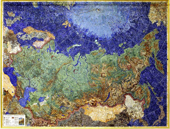 О мозаичном панно «Индустрия социализма», являющегося одним из выдающихся экспонатов Центрального научно-исследовательского геологоразведочного музея имени академика Ф.Н. Чернышева, написано немало статей и сняты многочисленные сюжеты для документальных фильмов. И действительно, панно размером 5910 х 4500 мм и площадью 26.6 кв.м впечатляет не только своими размерами, но и художественной ценностью. Это уникальный памятник российского камнерезного монументального декоративно-прикладного искусства конца 30-х годов XX века. Панно, изображающее точную физико-географическую карту СССР масштаба 1: 1 500 000, выполнено в технике флорентийской и русской мозаик с использованием кабошонированных ювелирных и ювелирно-поделочных камней. Аметист, яшма, синтетические рубины, алмазы, лазурит, опалы, аквамарины, изумруды – это лишь краткий перечень камней, использованных для создания уникального произведения искусства. Вышедший на 78 канале телесюжет в рамках программы «Другой Петербург» подробно рассказывает об истории создания карты и уникальной технике ее изготовления.