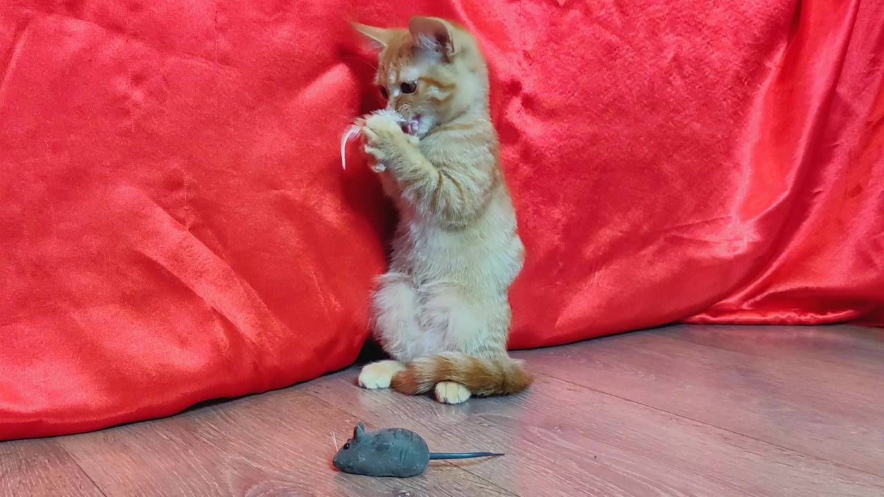 Рыжий котенок играет с перышком.